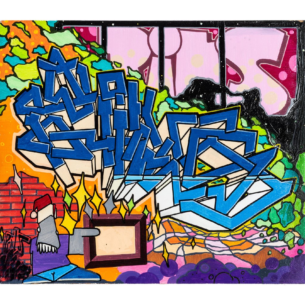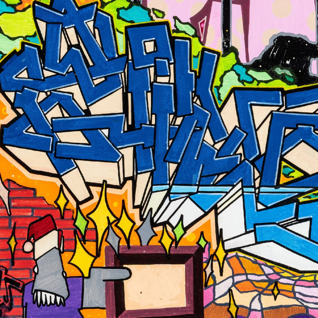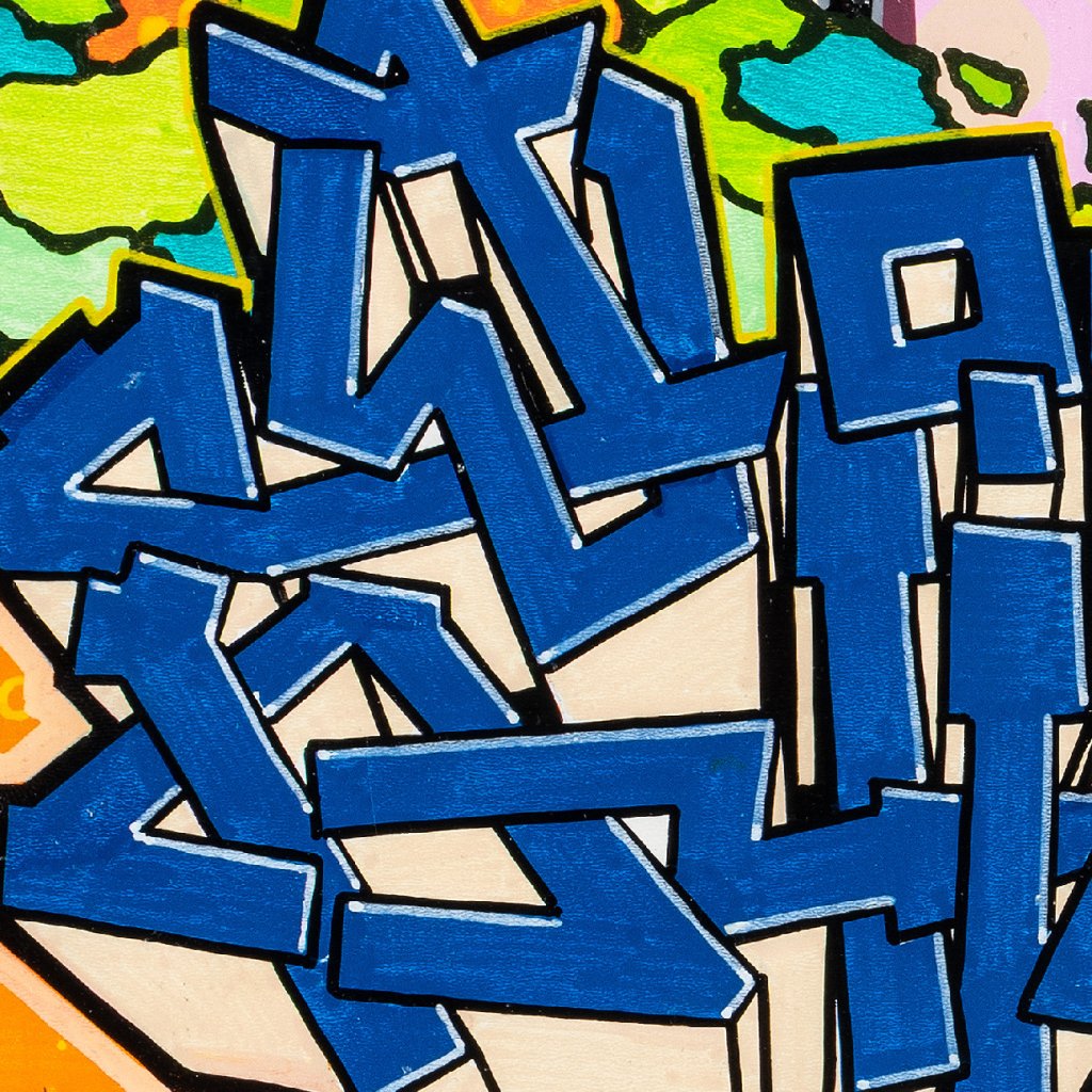 V levém dolním rohu nacházíme stylizovaný charakter – postavu writera v kulichu, který drží rám (možná obraz nebo prázdné plátno), což vytváří zajímavý „meta“ moment – obraz v obraze. Pozadí tvoří kombinace cihlové zdi, psychedelických mraků a růžového „skyline“ s bublinovými tvary v horní části. Práce fixem na sololitu umožňuje autorovi zachovat čistotu každého tahu. Práce s perspektivou a 3D stínováním u hlavního nápisu dodává dílu hloubku, zatímco zářivé žluté hvězdy (sparkles) vnášejí do kompozice klasický komiksový akcent. Kontrast mezi chladnou modří ústředního písma a hřejivými tóny oranžové a růžové v pozadí vytváří silné vizuální napětí, které diváka okamžitě vtáhne do děje.