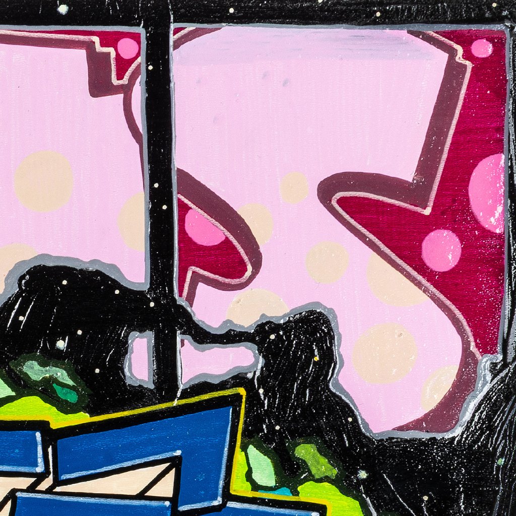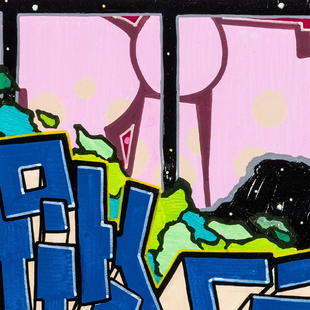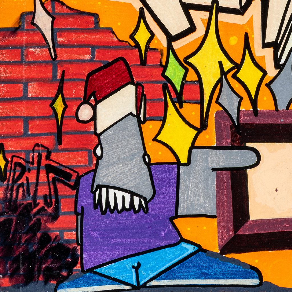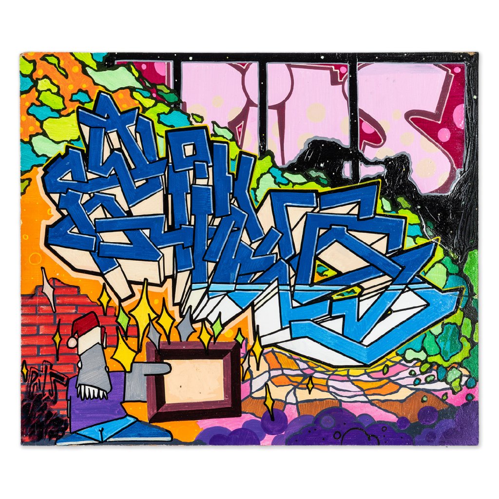 V levém dolním rohu nacházíme stylizovaný charakter – postavu writera v kulichu, který drží rám (možná obraz nebo prázdné plátno), což vytváří zajímavý „meta“ moment – obraz v obraze. Pozadí tvoří kombinace cihlové zdi, psychedelických mraků a růžového „skyline“ s bublinovými tvary v horní části. Práce fixem na sololitu umožňuje autorovi zachovat čistotu každého tahu. Práce s perspektivou a 3D stínováním u hlavního nápisu dodává dílu hloubku, zatímco zářivé žluté hvězdy (sparkles) vnášejí do kompozice klasický komiksový akcent. Kontrast mezi chladnou modří ústředního písma a hřejivými tóny oranžové a růžové v pozadí vytváří silné vizuální napětí, které diváka okamžitě vtáhne do děje.