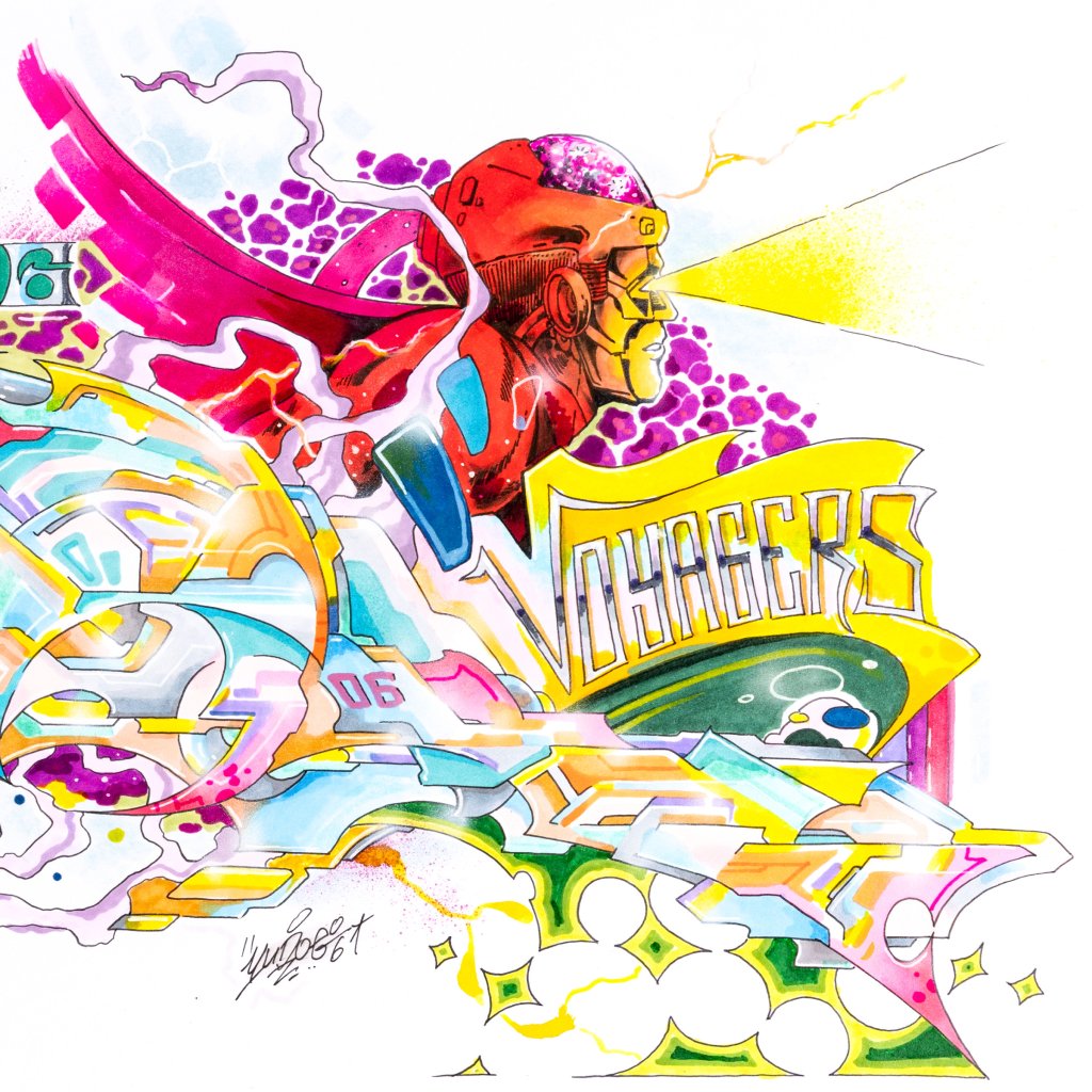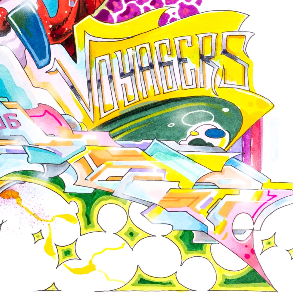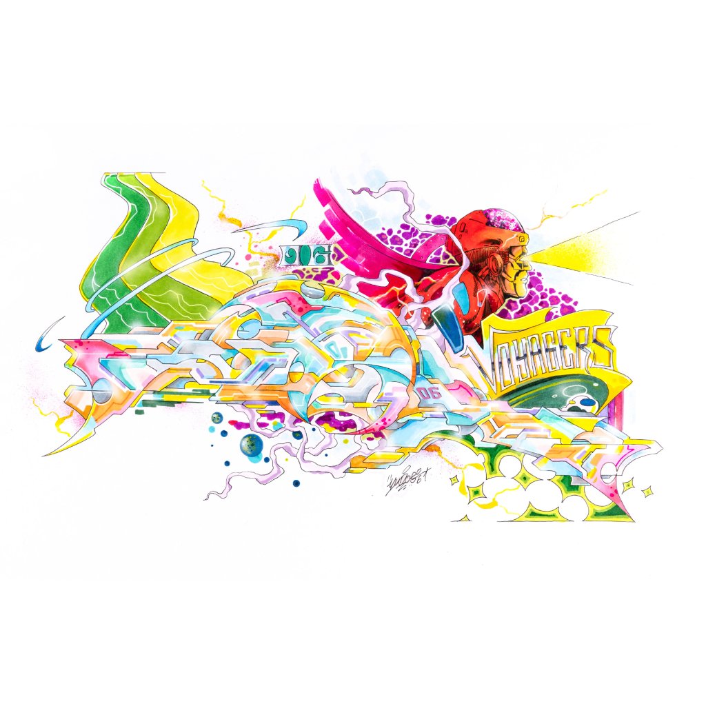 Autorská kresba fixem na papír - Graffiti Sketch - VOYAGERS, na rozdíl od komorních černobílých studií, představuje YUDOE 06 v jeho nejvíce signifikantním a energickém projevu: explozi barev a chytlavého příběhu. Je to vizuální manifestace jeho proslulých muralů, přenesená na papír.