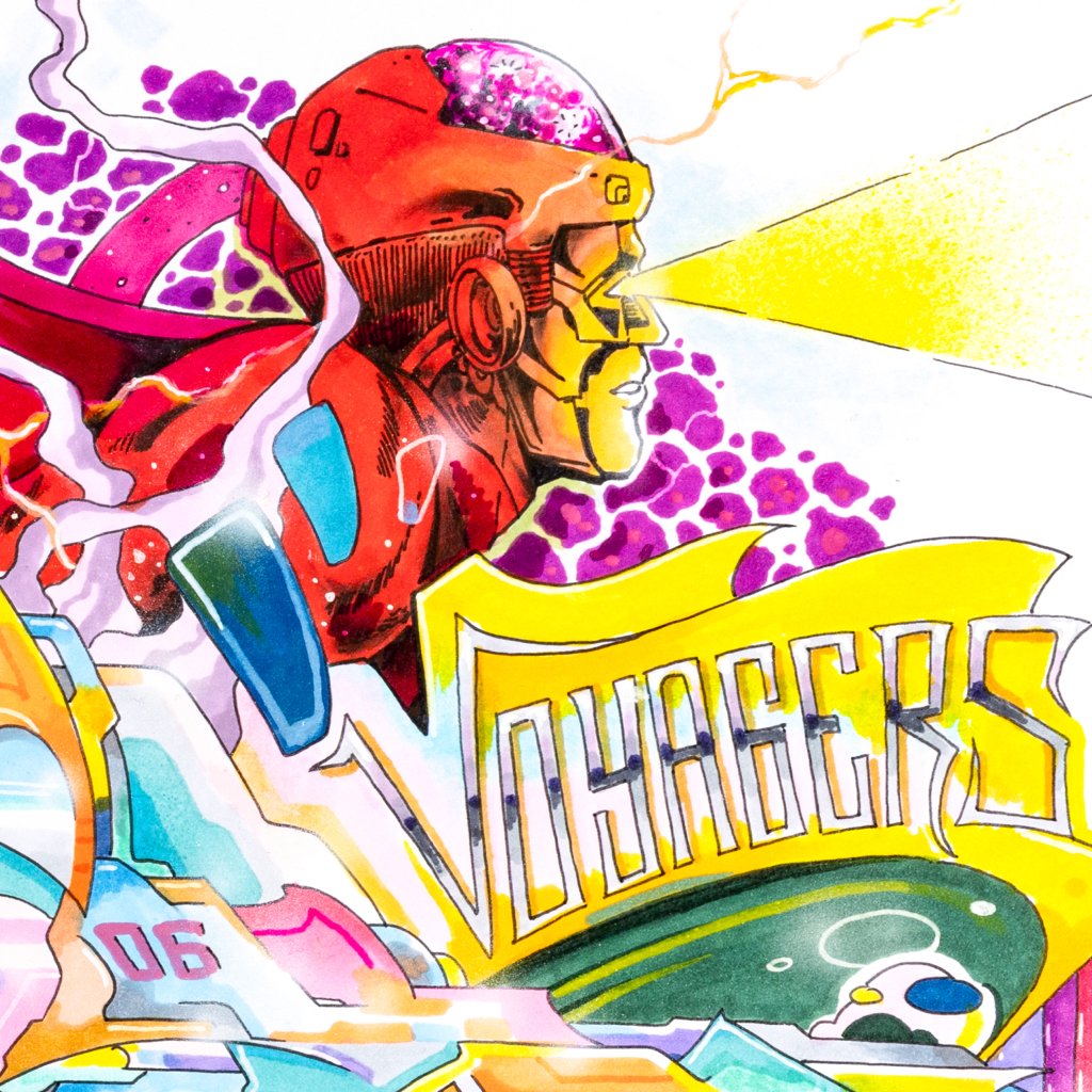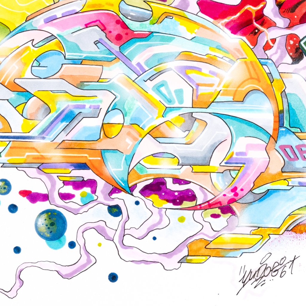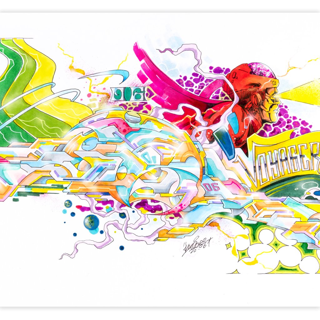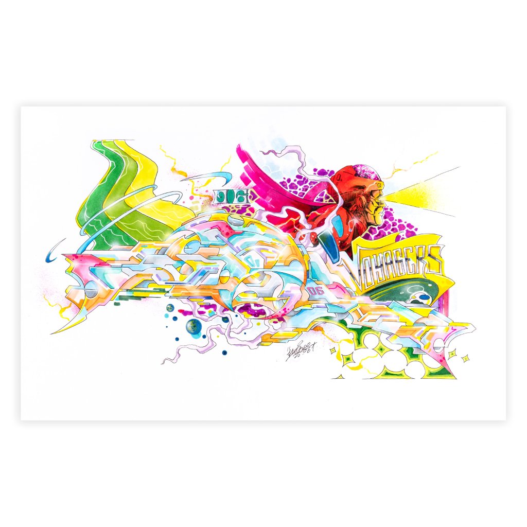 Autorská kresba fixem na papír - Graffiti Sketch - VOYAGERS, na rozdíl od komorních černobílých studií, představuje YUDOE 06 v jeho nejvíce signifikantním a energickém projevu: explozi barev a chytlavého příběhu. Je to vizuální manifestace jeho proslulých muralů, přenesená na papír.