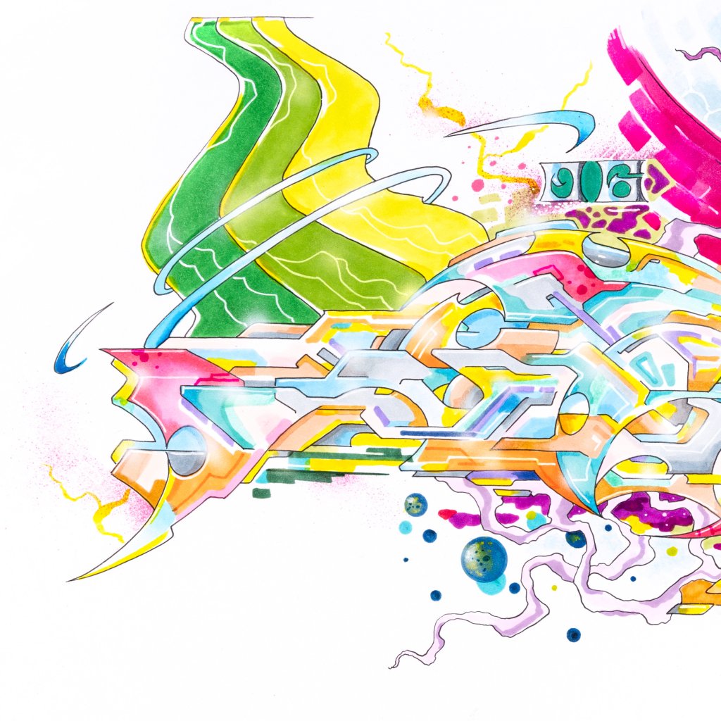 Kresba je dynamickou fúzí graffiti, komiksu a futurismu. Dominantou je stylizovaný, dekonstruovaný tag/písmo, které se proměňuje v krystalickou, zářivou architekturu. Autor mistrně pracuje s barevnými kombinacemi a digitální estetikou, i když je dílo provedeno ručně. Z vizuálního chaosu vystupuje komiksová postava s károvaným pláštěm a futuristickou helmou, zřejmě odkazující na jeho zájem o superhrdinskou ikonografii a sci-fi.