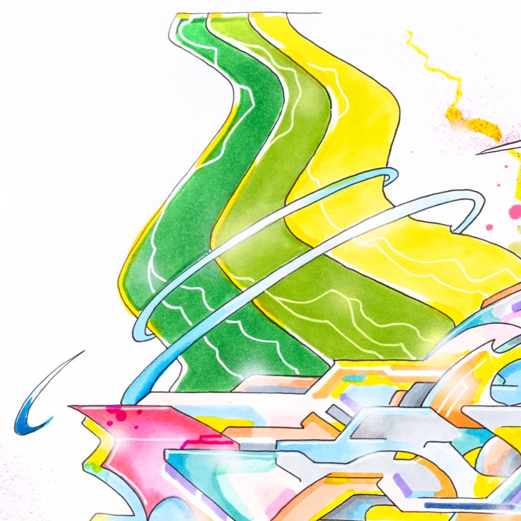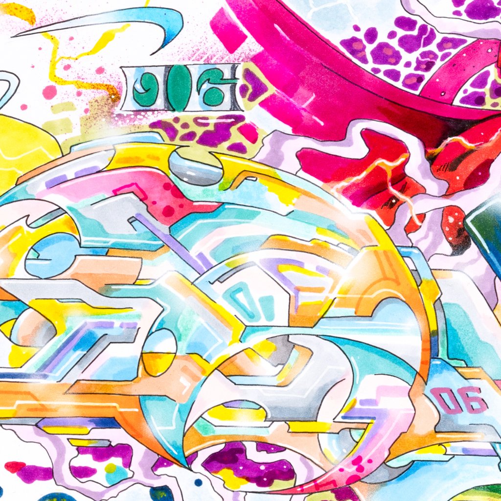 Použití jasných, neonových barev, stříkanců a dynamických linek dává dílu pocit pohybu, rychlosti a energie, který je pro autora typický. YUDOE 06 zde propojuje své hledání možností práce s písmem a jeho tvarem s vytvořením detailní propracovanosti a silného vizuálního příběhu.