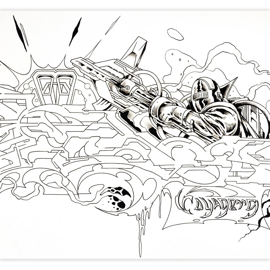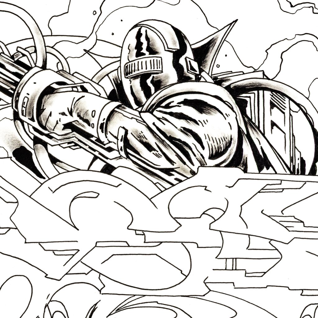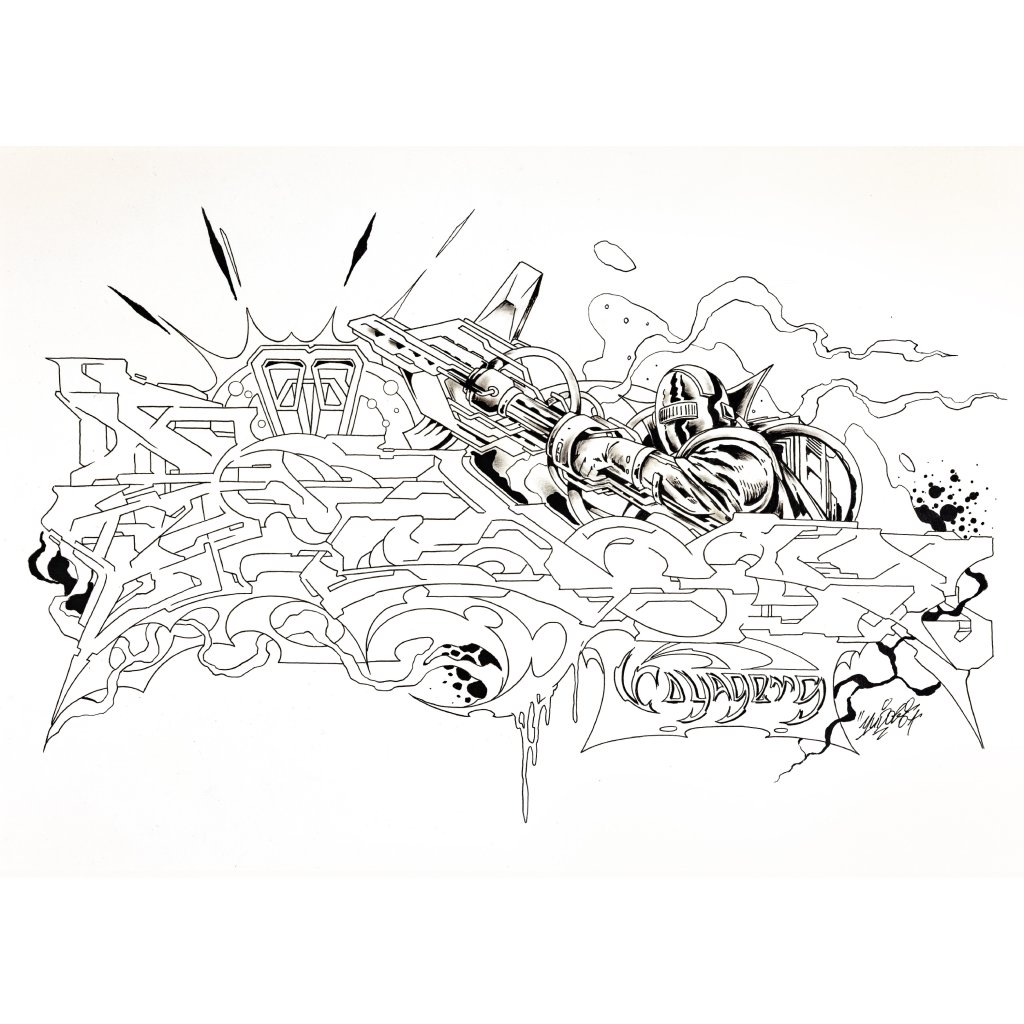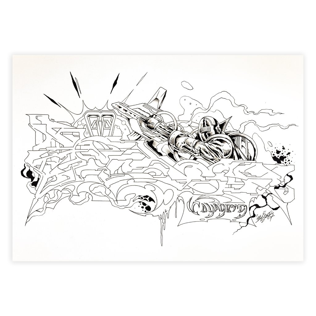 Tato dynamická černobílá kresba fixem představuje přímé spojení dvou klíčových rovin tvorby YUDOE 06: jeho kořenů ve veřejném prostoru a graffiti a jeho fascinace futurismem a komiksem.