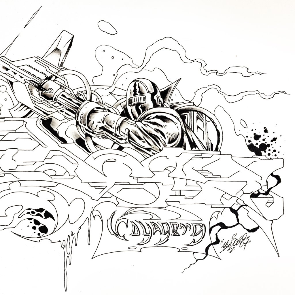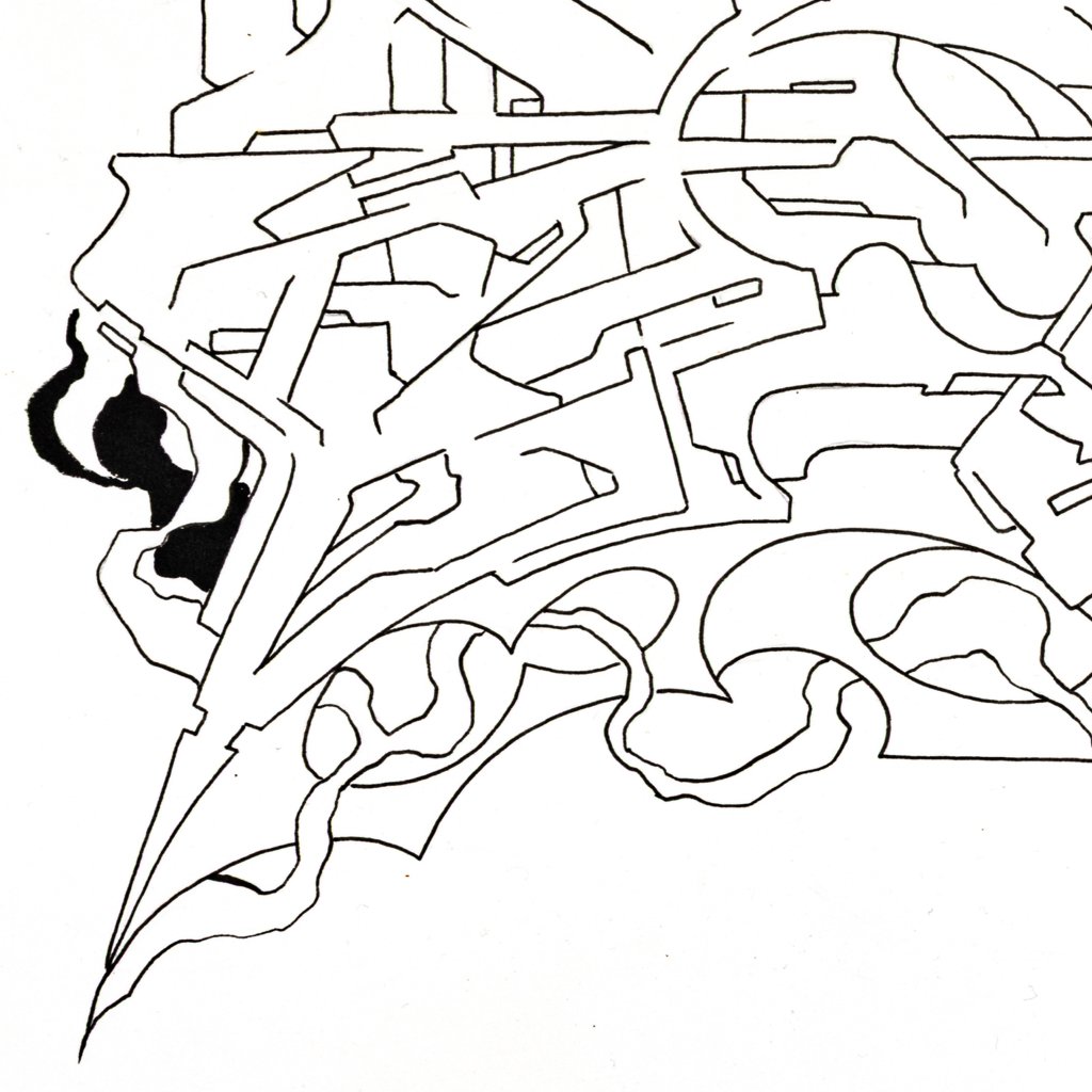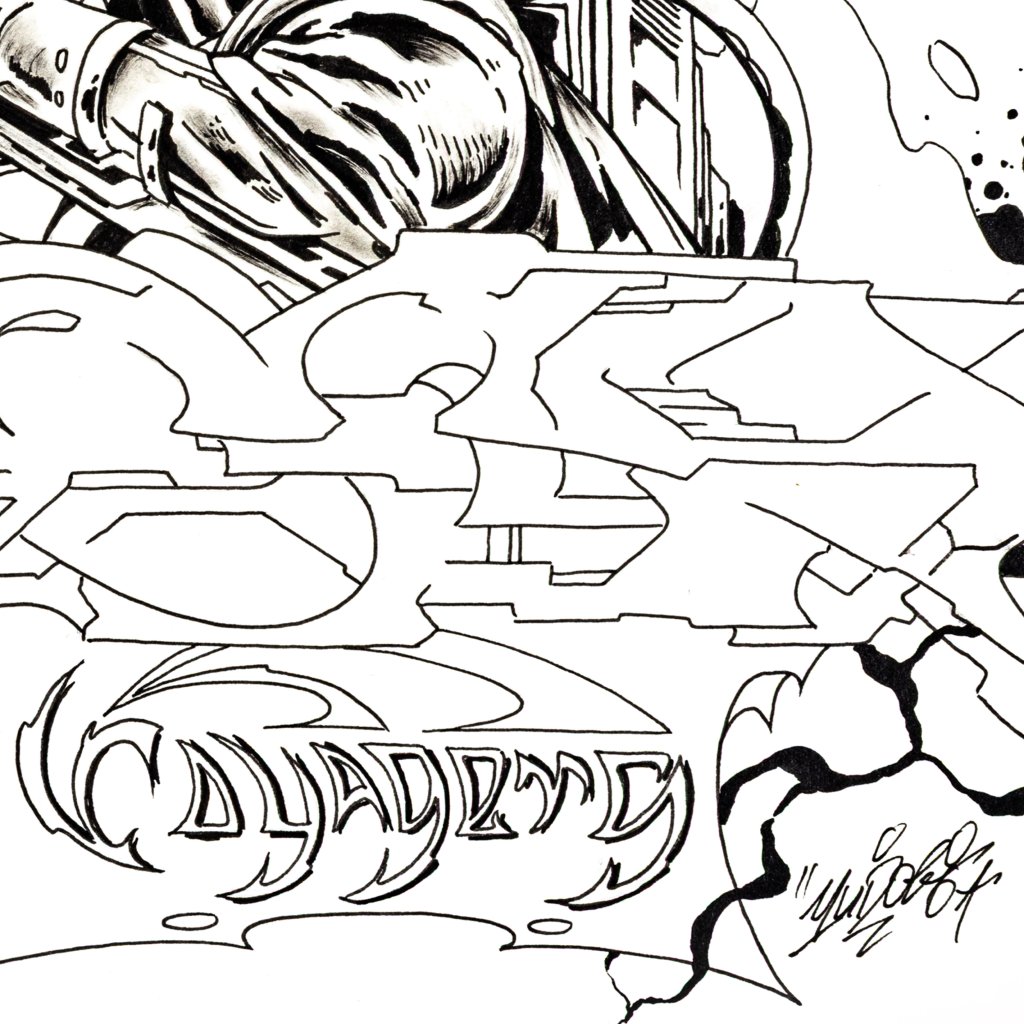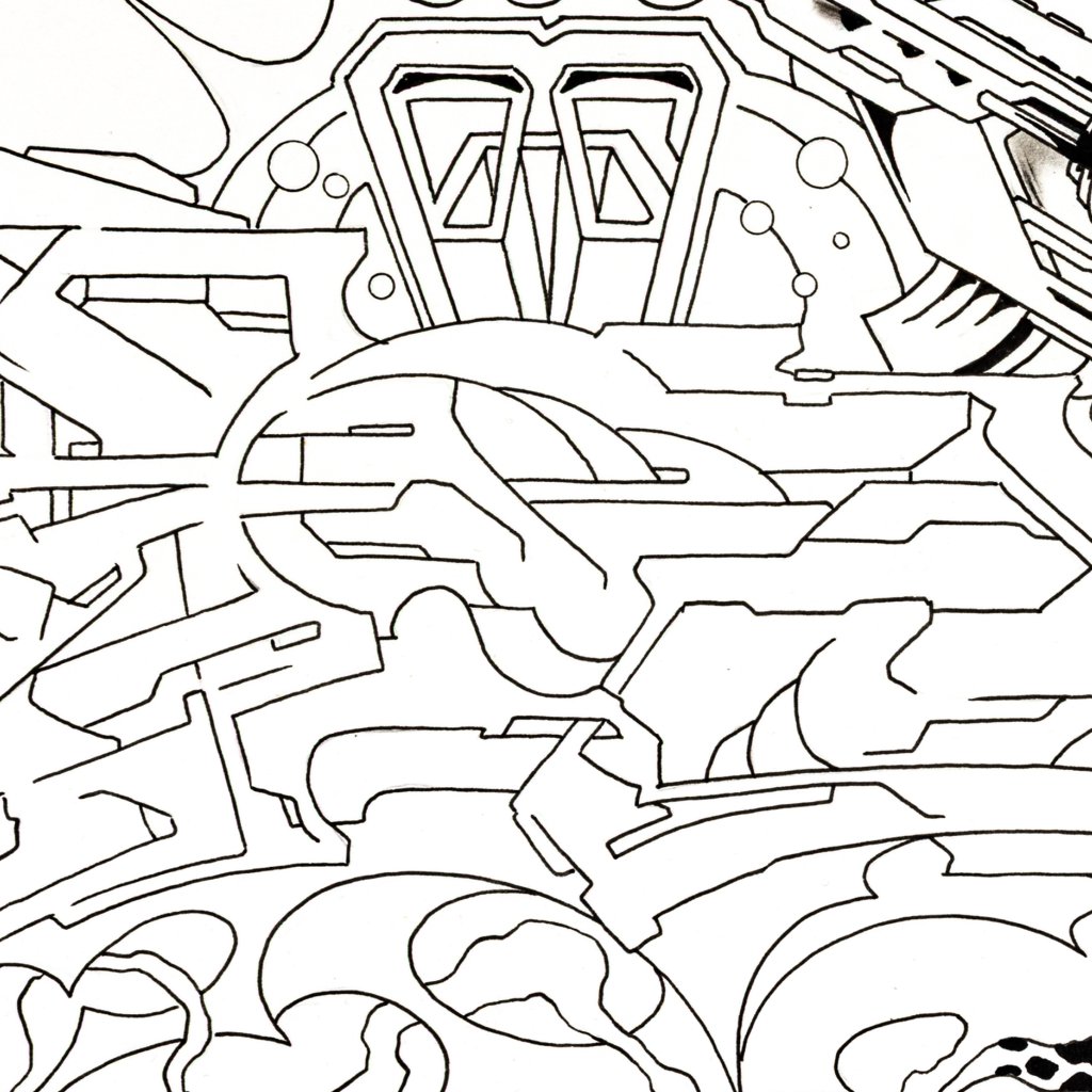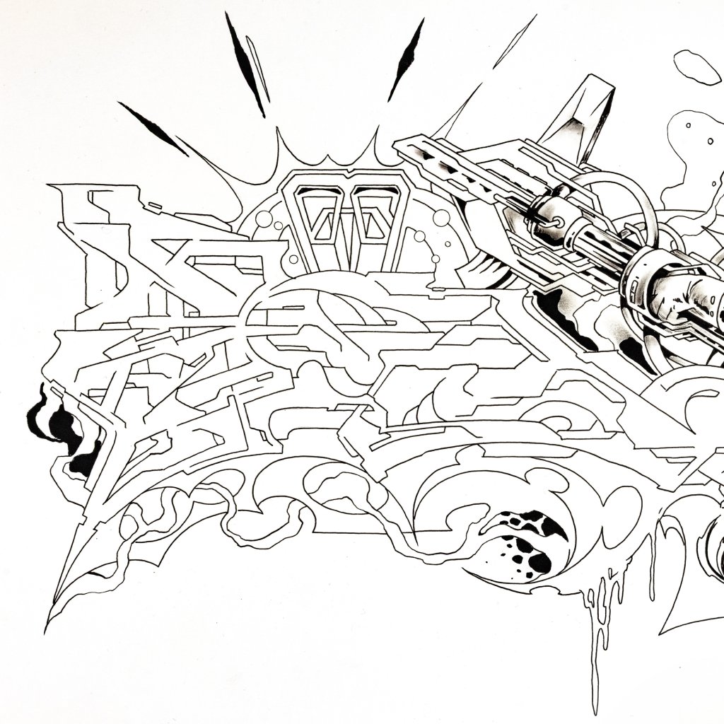 Tato dynamická černobílá kresba fixem představuje přímé spojení dvou klíčových rovin tvorby YUDOE 06: jeho kořenů ve veřejném prostoru a graffiti a jeho fascinace futurismem a komiksem.
