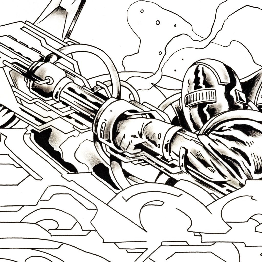 Na rozdíl od hyperdetailních, plně vystínovaných scén z předešlých kreseb, zde YUDOE 06 používá čistou, rychlou linku, která zdůrazňuje pohyb a syrovou energii. Kresba evokuje dojem pouliční rychlé skici či concept artu, který byl okamžitě a s jistotou převeden na papír.