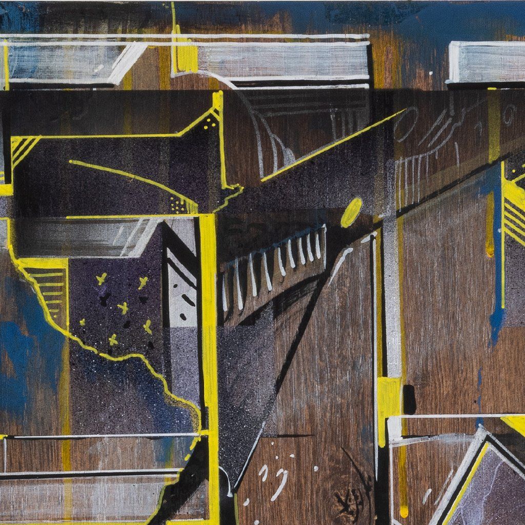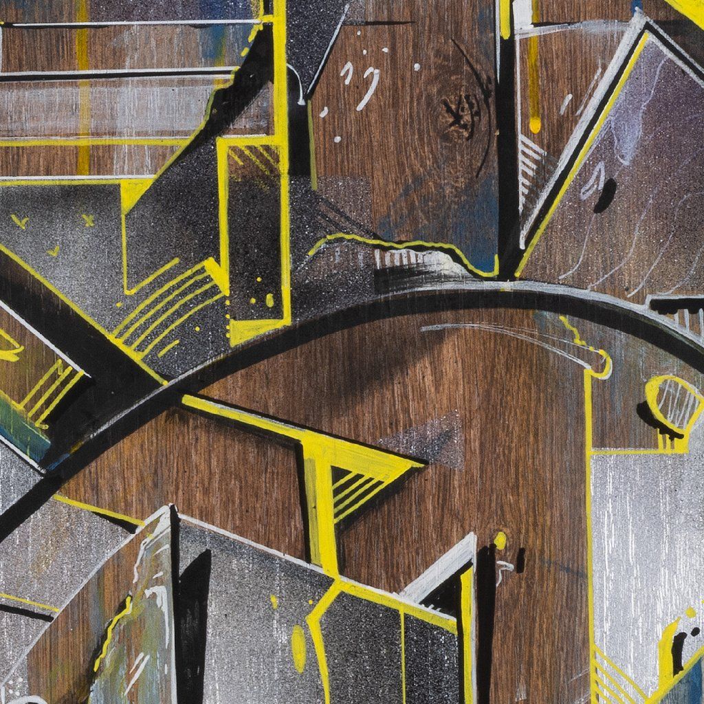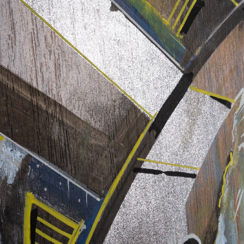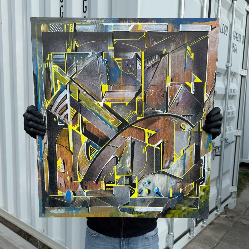 Sklon to tam sází v několika vrstvách a kombinuje věci, co by k sobě na první dobrou možná ani nešly: od jemnýho akvarelu přes poctivej tlak spreje až po finální, chirurgicky přesný linky fixem. Celá věc na sololitu funguje jako urbanistickej labyrint plnej ostrejch úhlů a vypálenejch žlutých highlightů, který tomu dávají nesmyslnej drive. Je to důkaz, že když se writer přesune z venku za zdi ateliéru, nemusí ztratit koule – naopak, dává mu to prostor pro hlubší layerování a techniku, která tě nenechá jen tak projít kolem. Čistý vizuální flow.