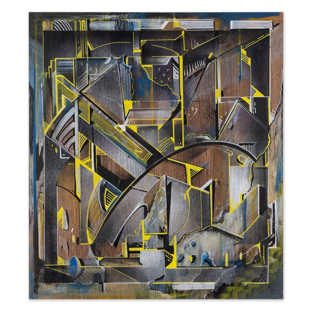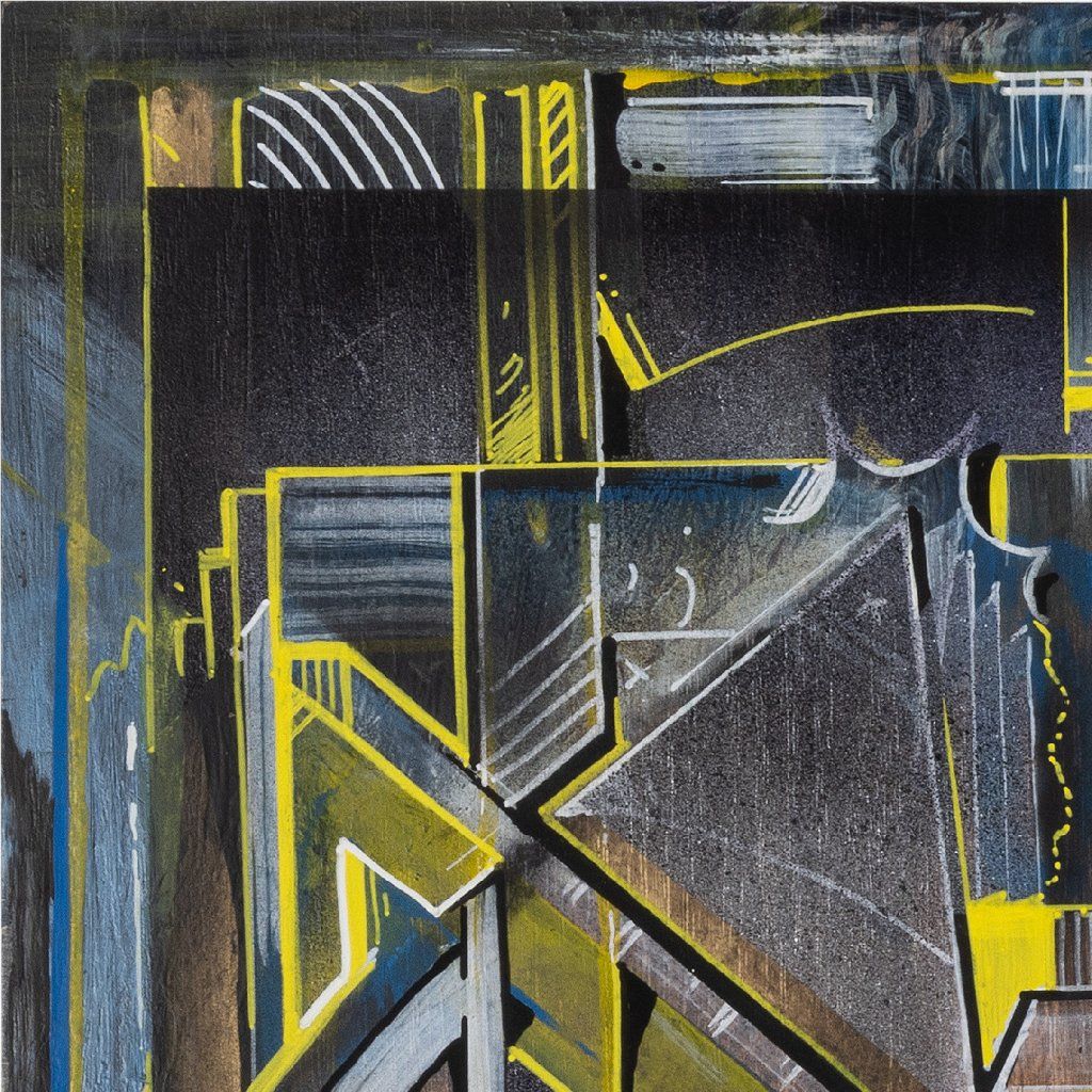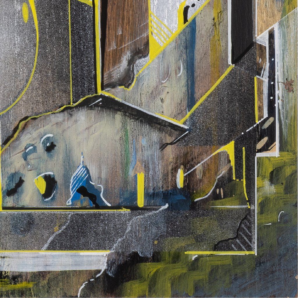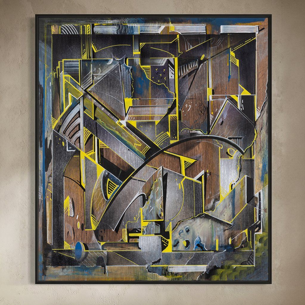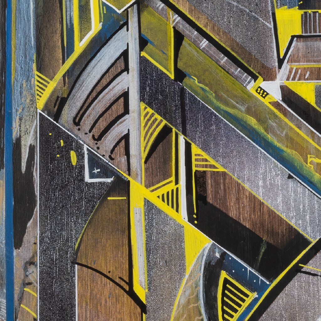 Sklon to tam sází v několika vrstvách a kombinuje věci, co by k sobě na první dobrou možná ani nešly: od jemnýho akvarelu přes poctivej tlak spreje až po finální, chirurgicky přesný linky fixem. Celá věc na sololitu funguje jako urbanistickej labyrint plnej ostrejch úhlů a vypálenejch žlutých highlightů, který tomu dávají nesmyslnej drive. Je to důkaz, že když se writer přesune z venku za zdi ateliéru, nemusí ztratit koule – naopak, dává mu to prostor pro hlubší layerování a techniku, která tě nenechá jen tak projít kolem. Čistý vizuální flow.