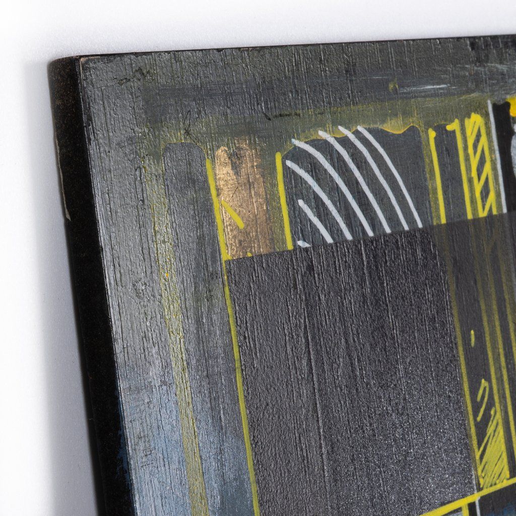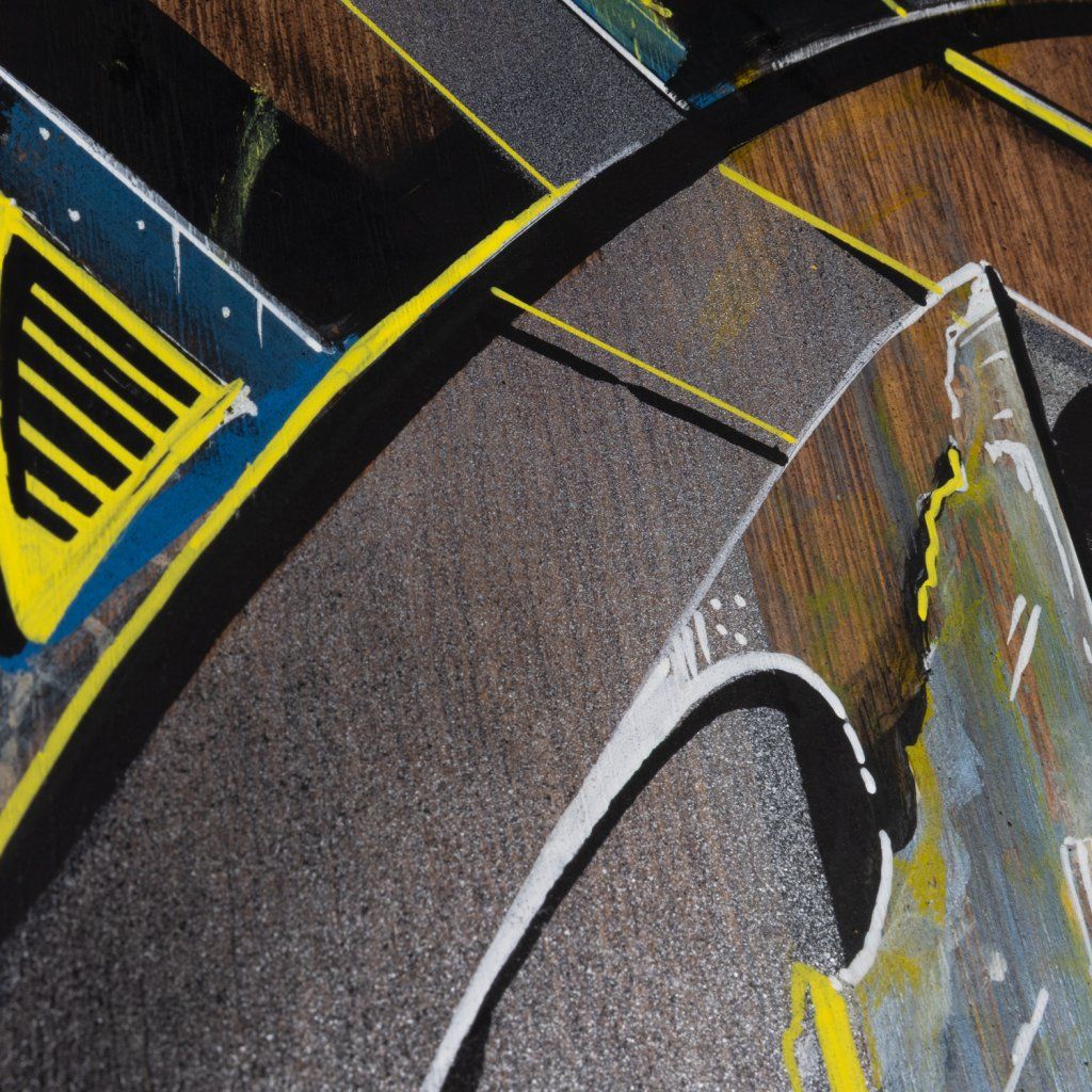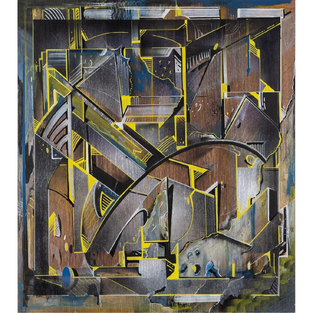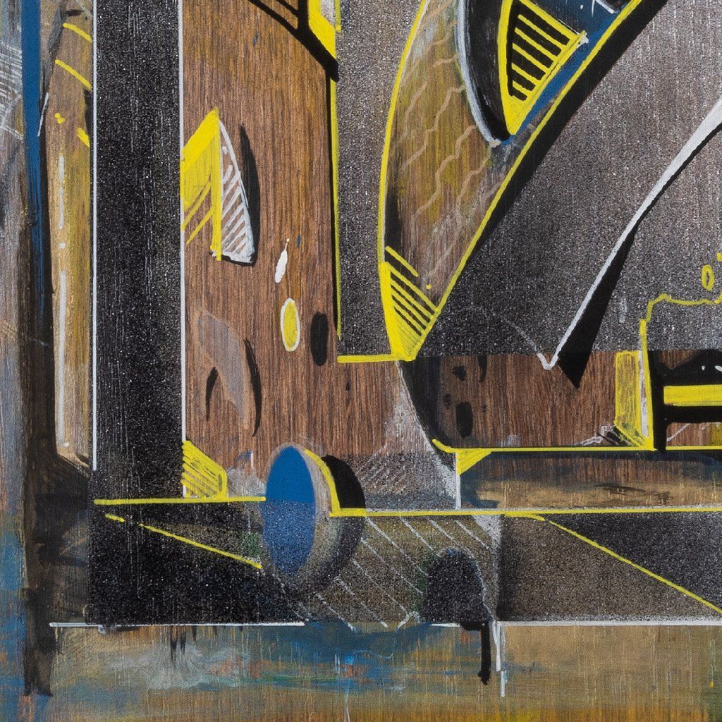 Sklon to tam sází v několika vrstvách a kombinuje věci, co by k sobě na první dobrou možná ani nešly: od jemnýho akvarelu přes poctivej tlak spreje až po finální, chirurgicky přesný linky fixem. Celá věc na sololitu funguje jako urbanistickej labyrint plnej ostrejch úhlů a vypálenejch žlutých highlightů, který tomu dávají nesmyslnej drive. Je to důkaz, že když se writer přesune z venku za zdi ateliéru, nemusí ztratit koule – naopak, dává mu to prostor pro hlubší layerování a techniku, která tě nenechá jen tak projít kolem. Čistý vizuální flow.