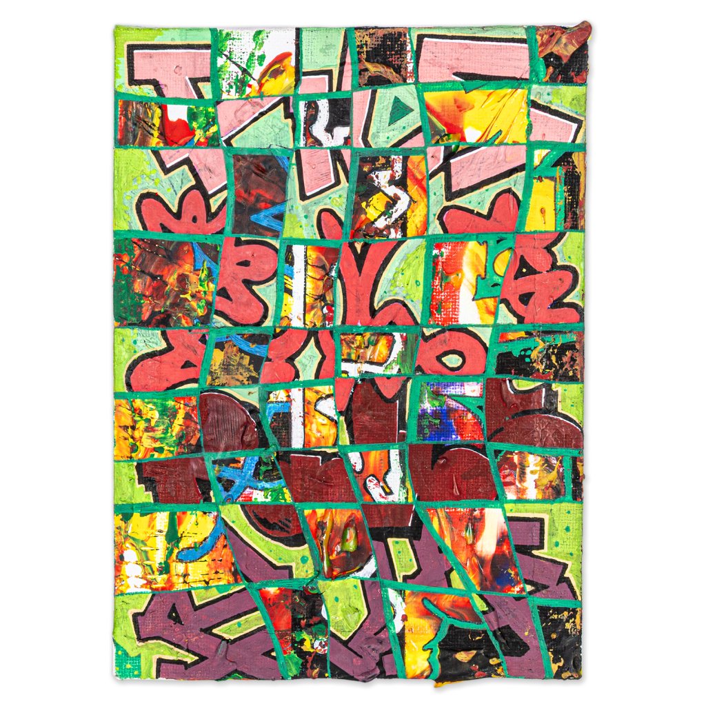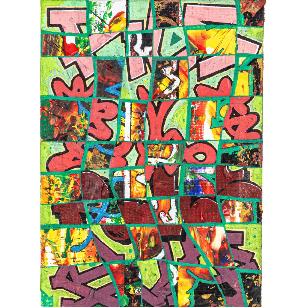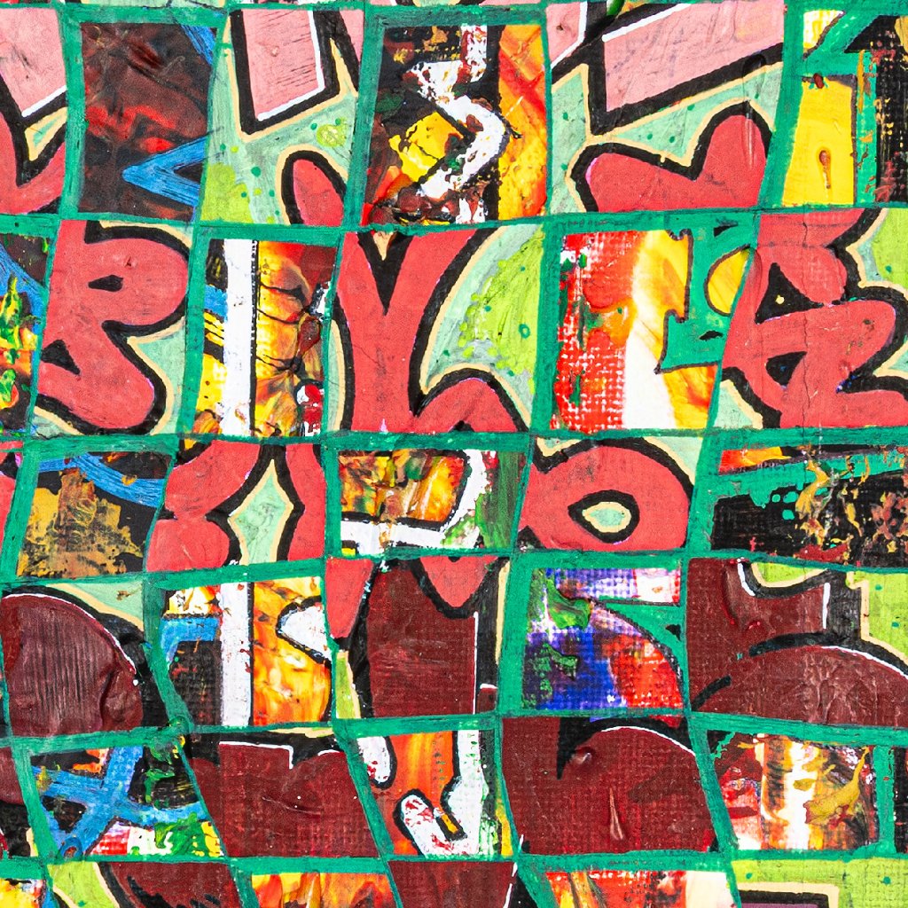 Zelená mřížka, která nepravidelně dělí plochu plátna, vytváří dojem rozbitého skla nebo pohledu skrz pletivo. Pod touto strukturou se odehrává bohatá vizuální hostina – fragmenty „bubble letters“, ostré hroty tagů a syté barevné plochy v odstínech cihlové, žluté a fialové. Čtverce jsou důkazem, že graffiti na plátně nemusí být jen o nápisu. Je to o struktuře města, o vrstvách barev na starých fasádách a o odvaze rozbít celek na tisíc kousků, aby vznikl nový, komplexnější význam.