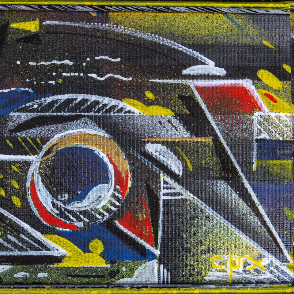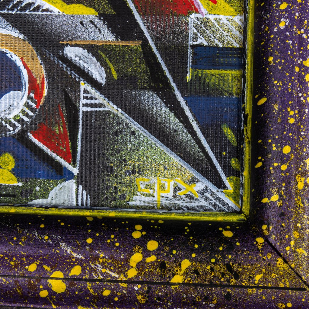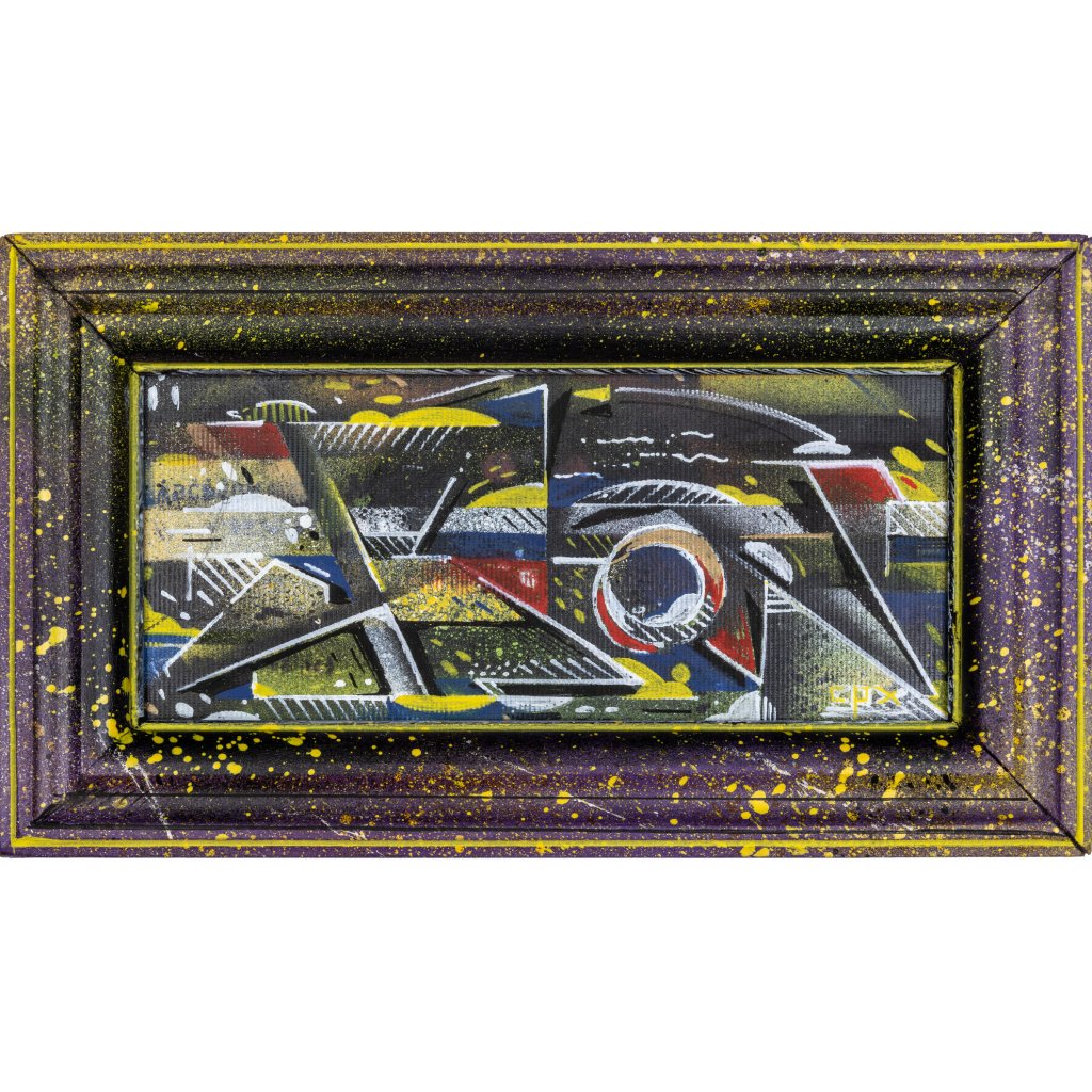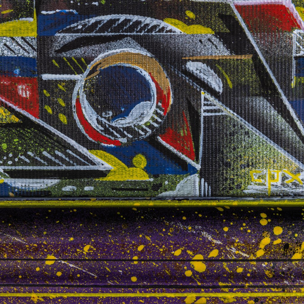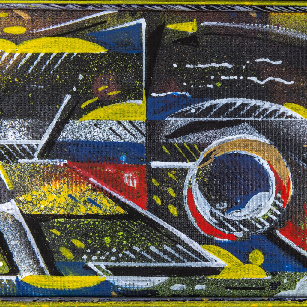 Autor zde uplatňuje krédo graffiti estetiky, kde se fragmenty písma, ostré úhly a základní barvy (žlutá, červená, modrá a černá) srážejí v nečekaném řádu. Kombinovaná technika na sololitu využívá sprejové stínování k vytvoření hloubky a precizní tahy fixem a akrylem pro definování struktury.