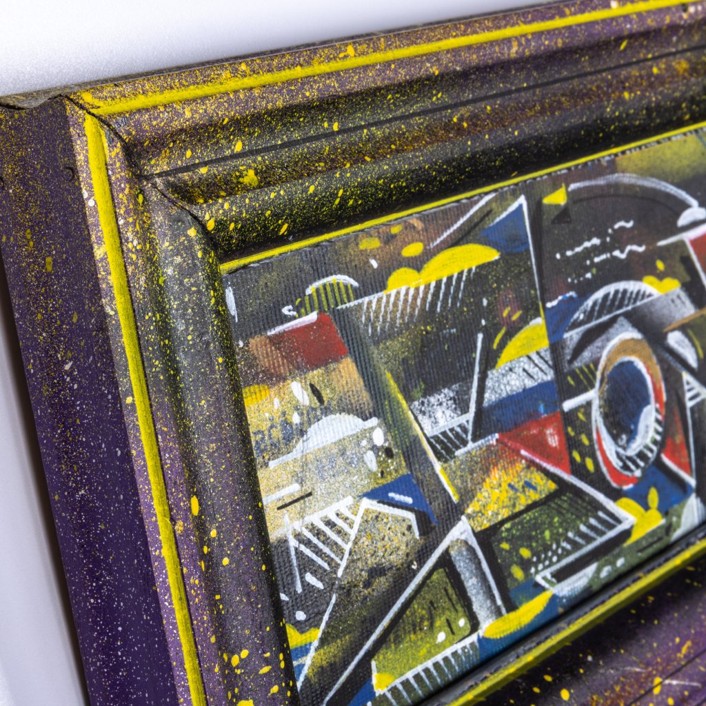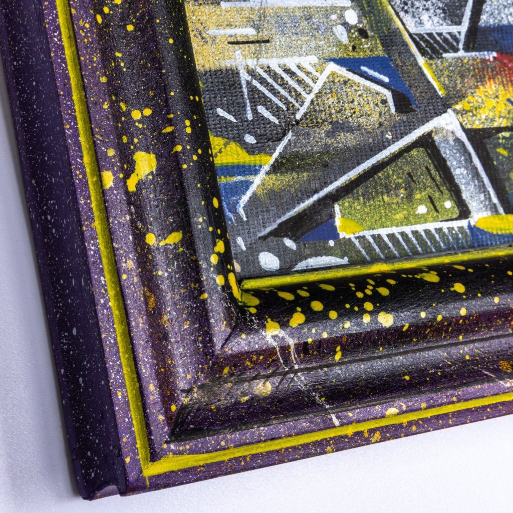 Výrazný je autorsky upravený rám, který s splatter efektem (postříkáním žlutou barvou na fialovém základu) tvoří integrální součást díla. Celek tak působí jako vypreparovaný vizuální kód z pouliční zdi.