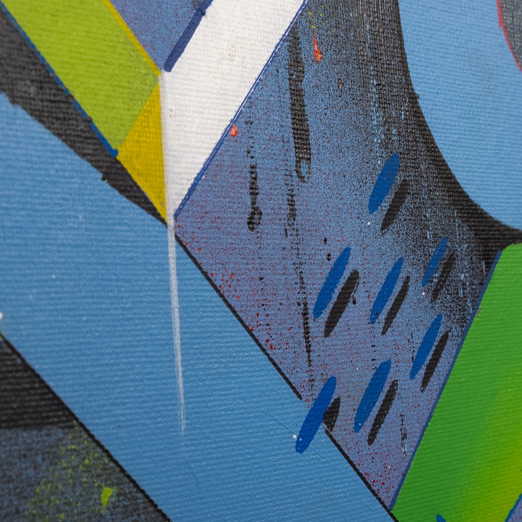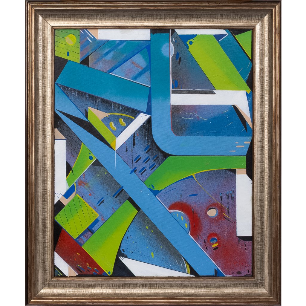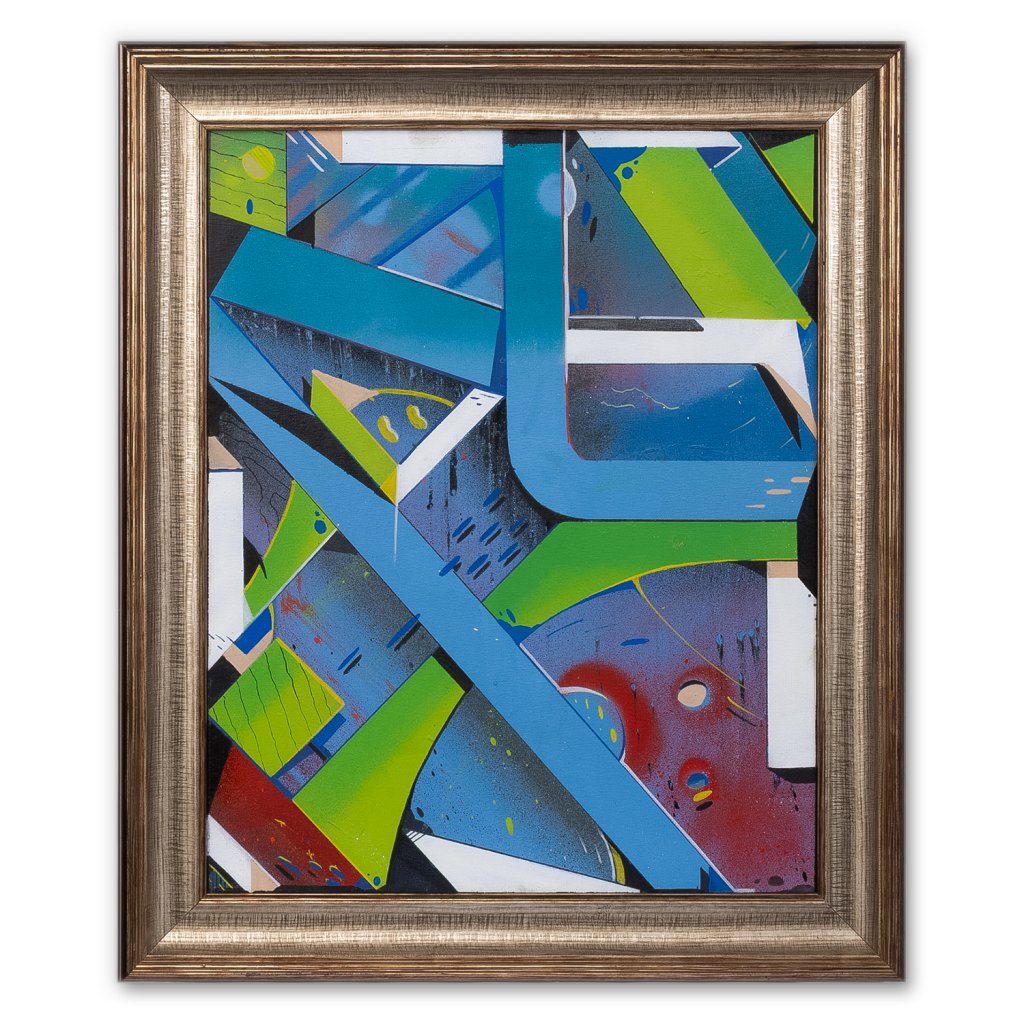 Dílo je vizuální hádankou tvořenou ostrými úhly, překrývajícími se liniemi a plošnými barevnými segmenty. Paleta dominuje chladnými tóny modré a zelené, které jsou proťaty akcenty žluté a červené. Kompozice evokuje dojem rozloženého písma nebo dekonstruovaného loga – estetika hluboce zakořeněná v graffiti a kybernetickém designu. Rámování navíc podtrhuje kontrast mezi divokou, energickou malbou a klasickou prezentací.