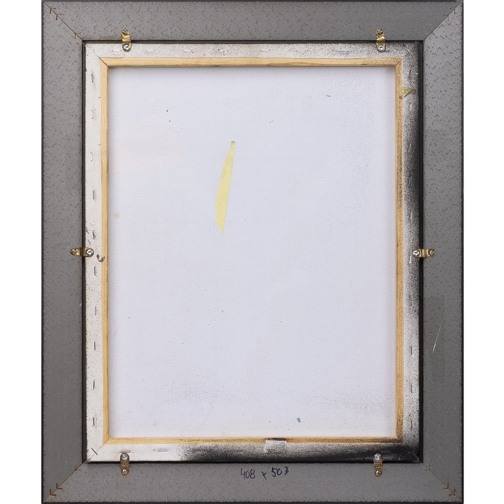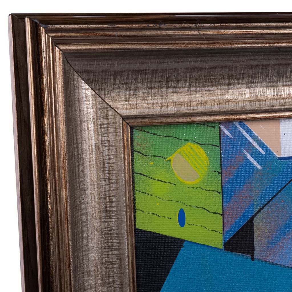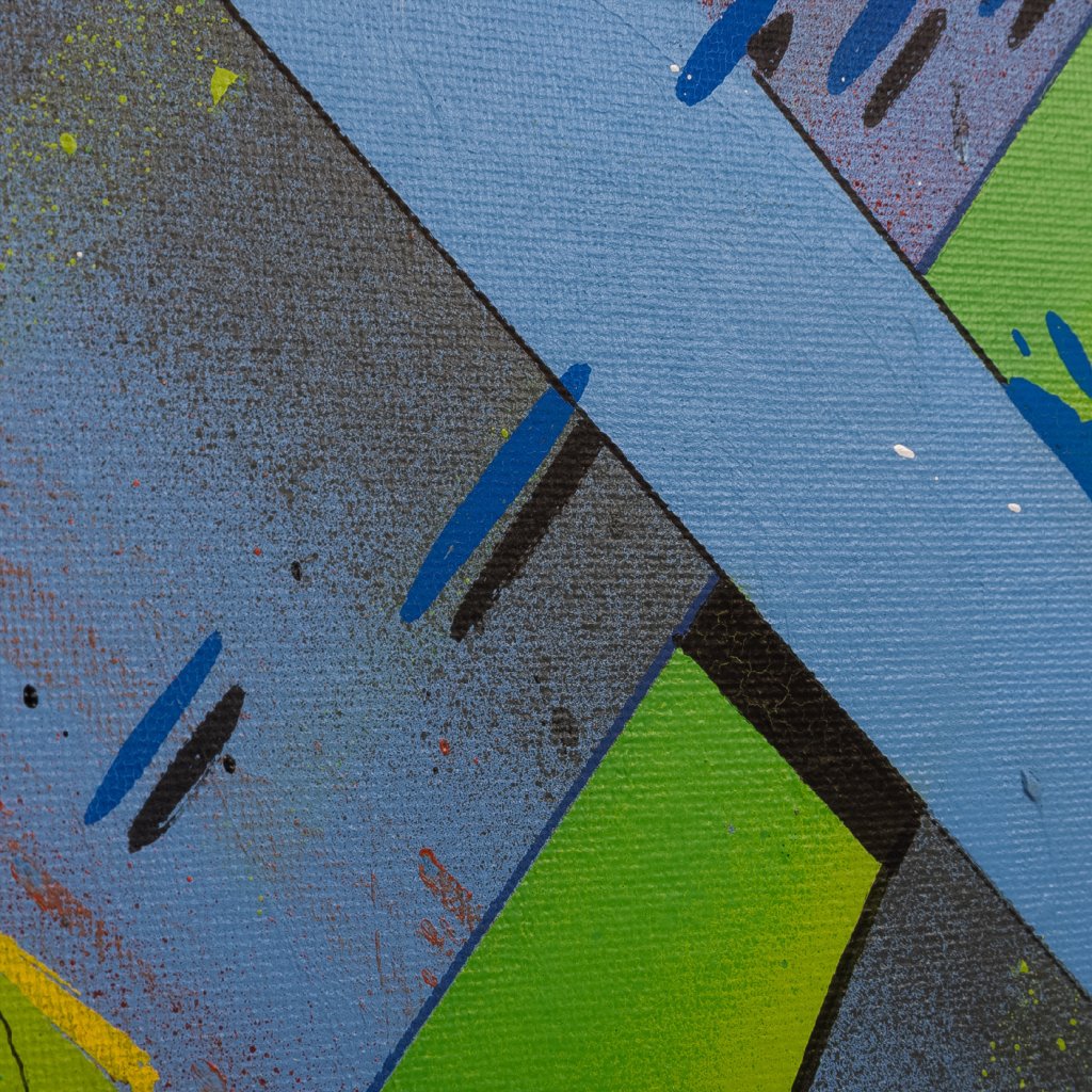 Dílo je vizuální hádankou tvořenou ostrými úhly, překrývajícími se liniemi a plošnými barevnými segmenty. Paleta dominuje chladnými tóny modré a zelené, které jsou proťaty akcenty žluté a červené. Kompozice evokuje dojem rozloženého písma nebo dekonstruovaného loga – estetika hluboce zakořeněná v graffiti a kybernetickém designu. Rámování navíc podtrhuje kontrast mezi divokou, energickou malbou a klasickou prezentací.