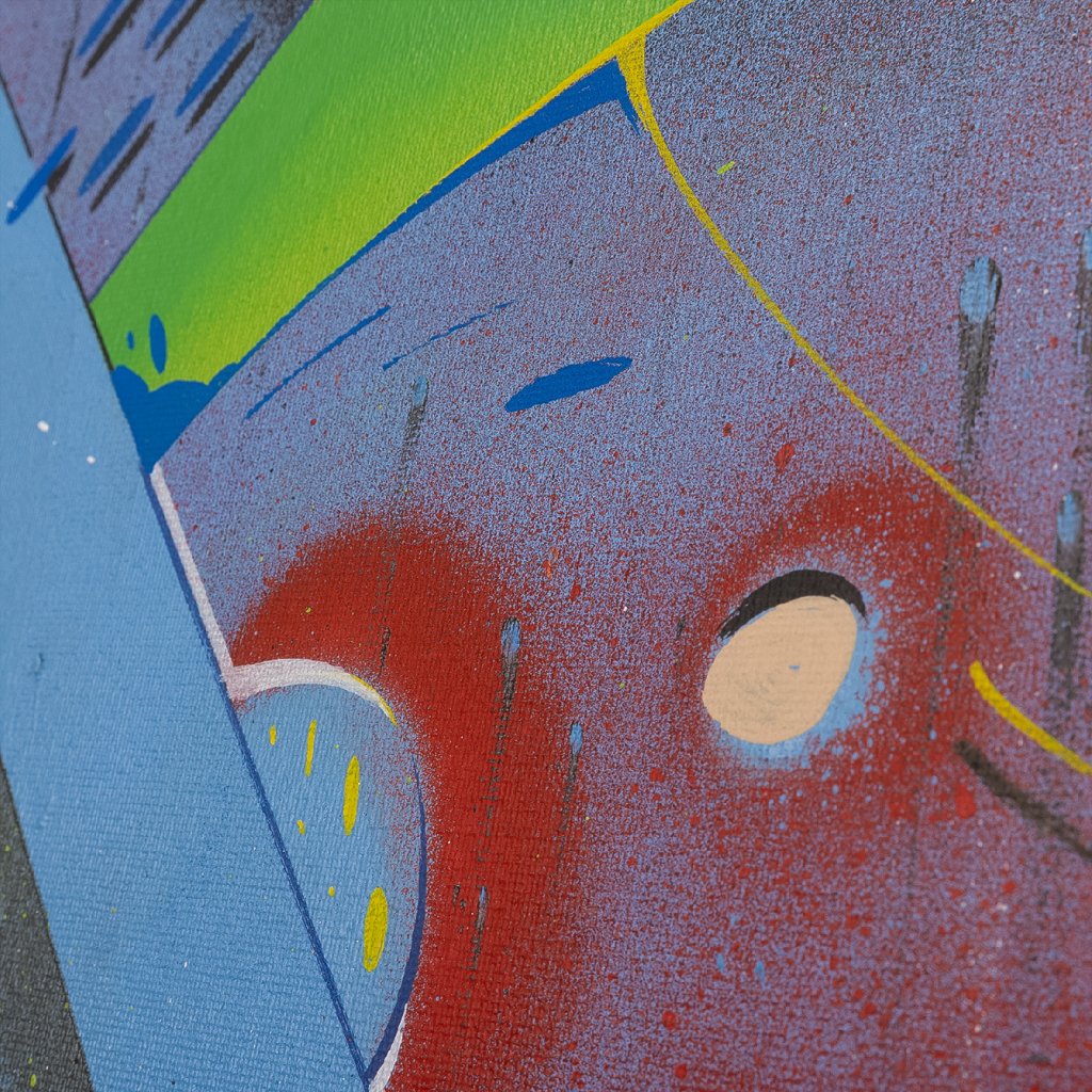 SKLON využívá sprej nejen k rychlému nanášení barvy, ale i k vytváření texturálních efektů, stékanců a stínů, které dodávají geometrickým plochám hloubku a haptickou kvalitu. „Jacoby Gepreux“ je energický a intelektuální kus, který zkoumá vztah mezi chaosem a řádem, plochou a hloubkou. Je to skvělá ukázka současného graffiti-artu, který se posunul od ulice k plátnu, zachovávající si však svou dynamiku a vizuální naléhavost.