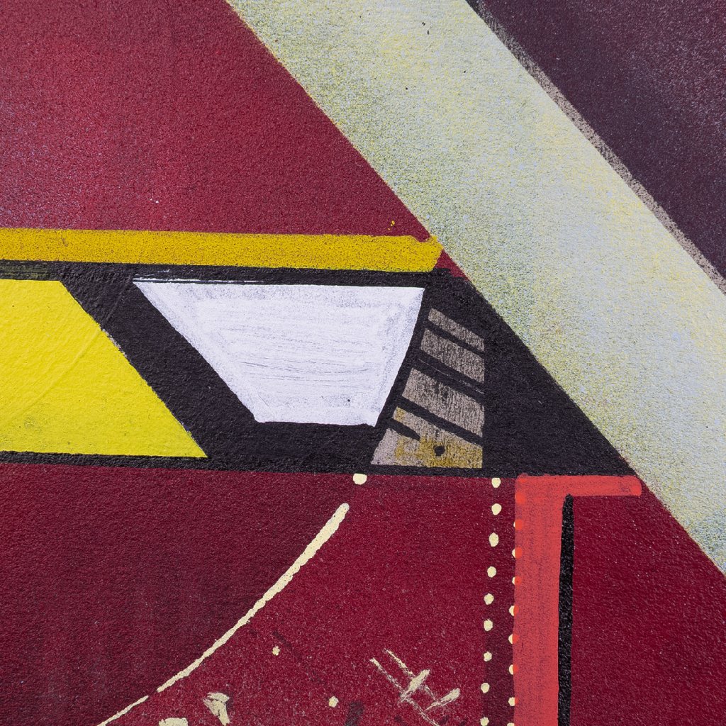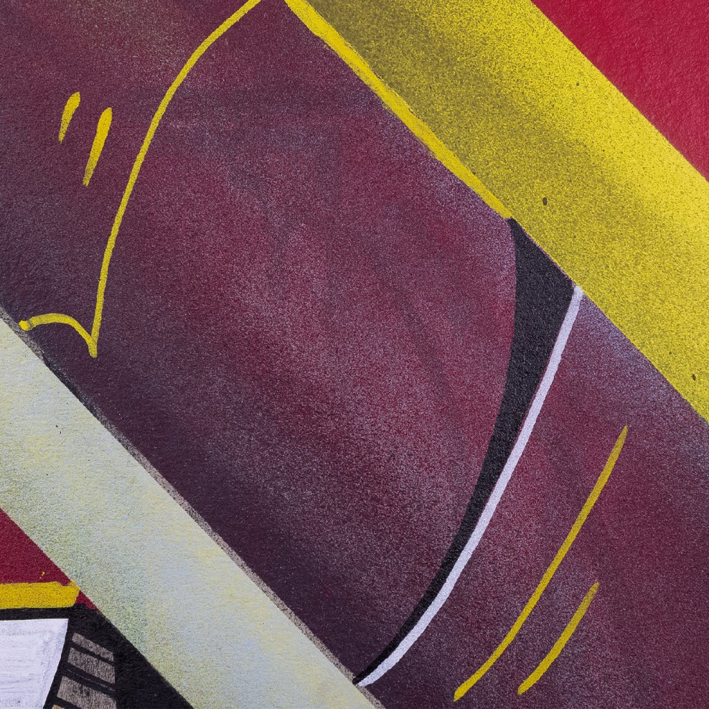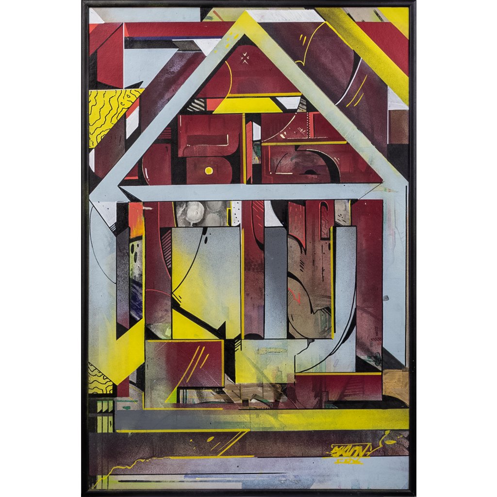 SKLON mistrně využívá kombinovanou techniku akrylu a spreje na kartonu, kdy se přesné, ostré hrany geometrických segmentů střídají s raw, sprejovými texturami a stékanci. Motiv písma a stylizovaných čísel je hluboce zasazen do struktury domu, čímž dílo odkazuje na autorovy kořeny v graffiti estetice a neustálé hledání rovnováhy mezi pouliční dynamikou a galerijní precizností.