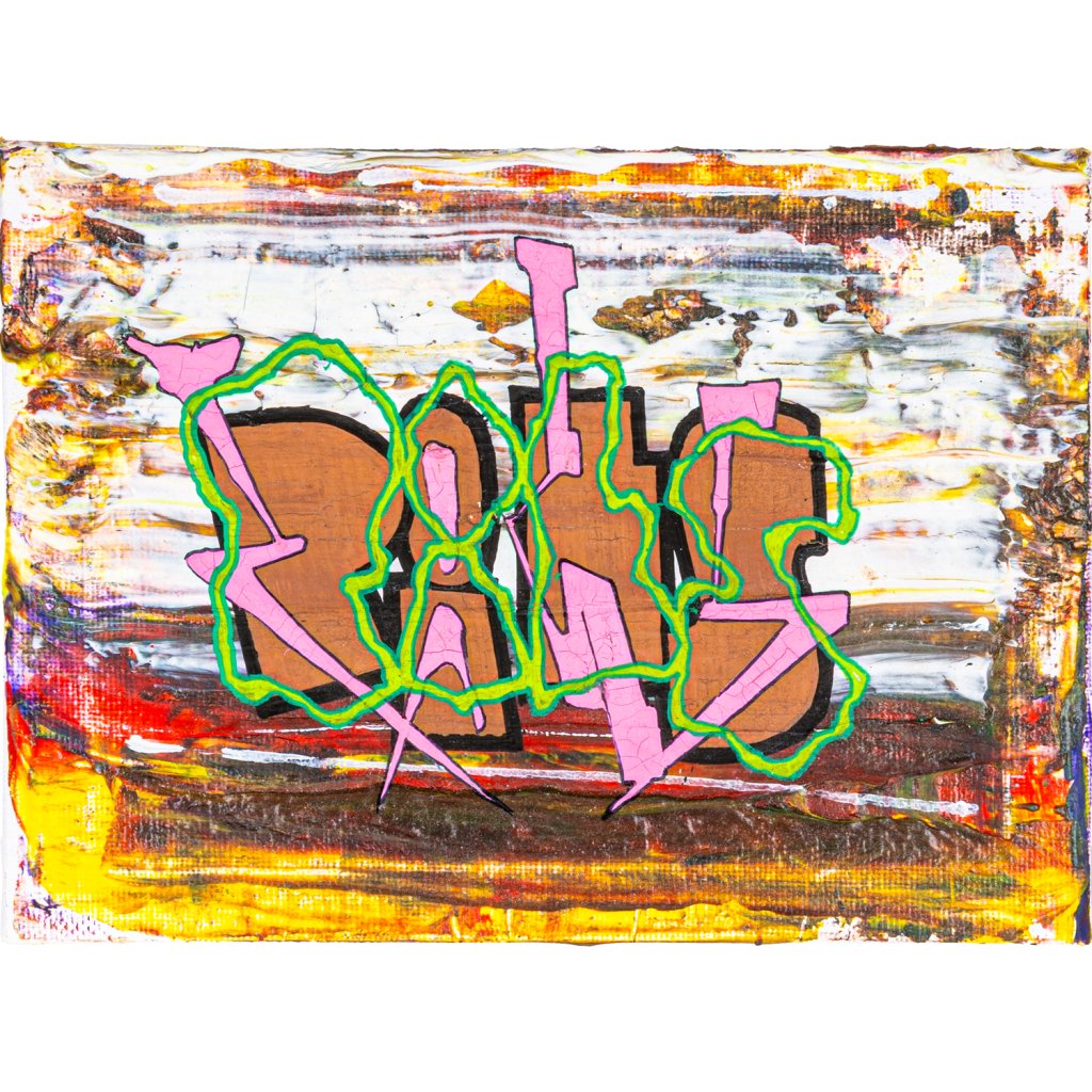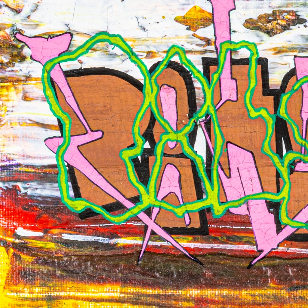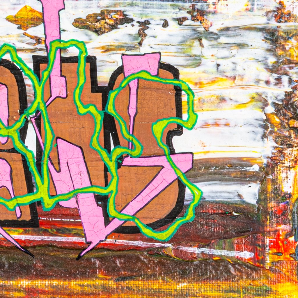 Středobodem kompozice je robustní, hnědý „throw-up“, který tvoří stabilní jádro obrazu. Přes něj jsou však nekompromisně vrstveny další úrovně – růžové ostré linky a svítivě neonový zelený obrys. Tento postup vytváří dojem neustálého přepisování a doplňování, což je proces důvěrně známý z ulic měst. Toto dílo je pro ty, kteří oceňují graffiti v jeho nejčistší formě – jako hru s písmenem a jménem. PiLS zde dokazuje, že i klasický tag může mít hloubku a komplexnost hodnou galerijního prostoru.