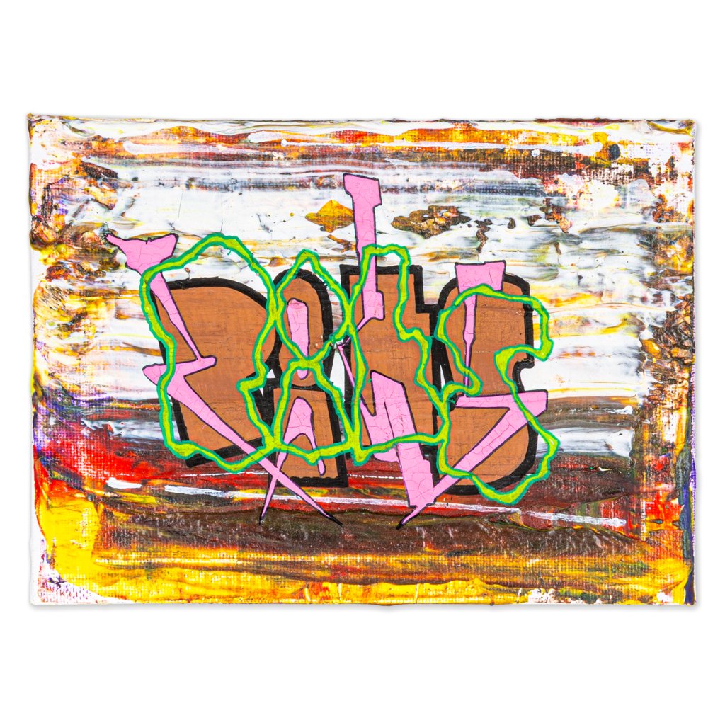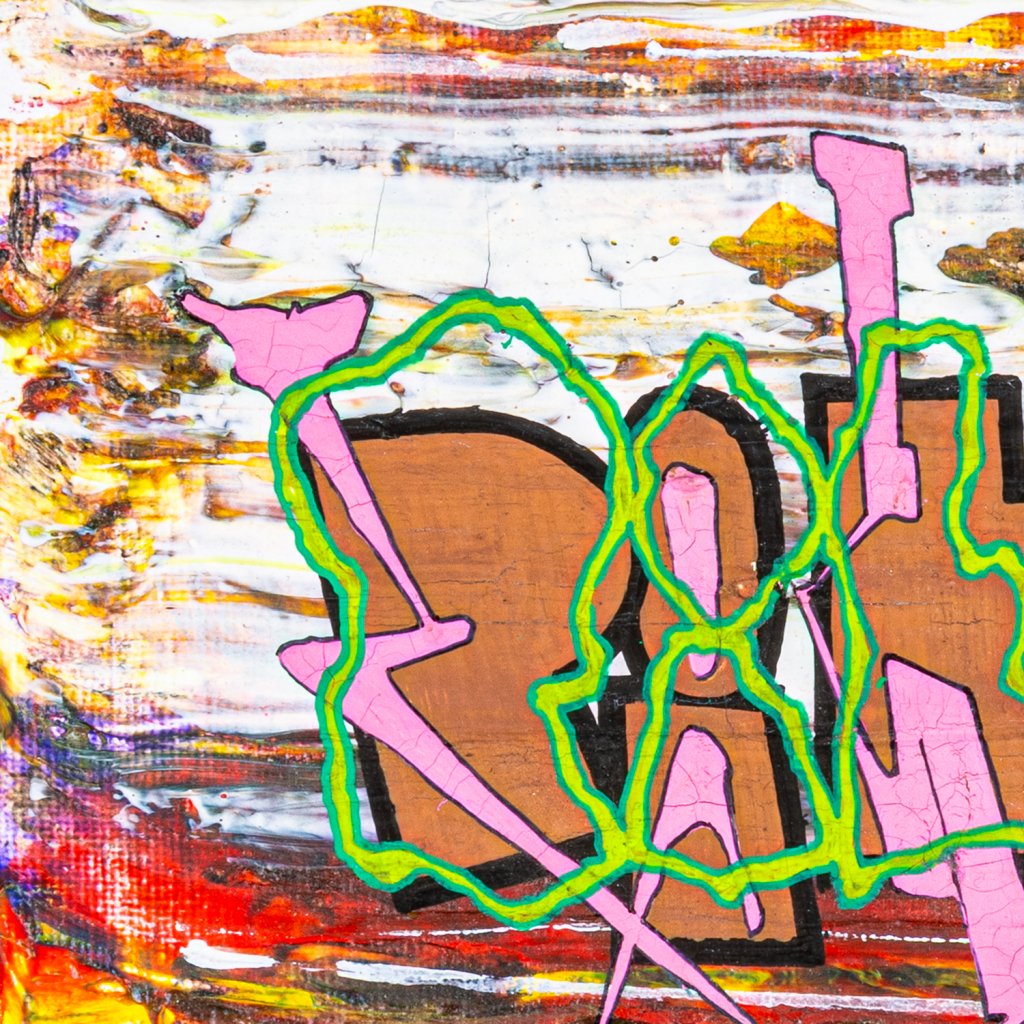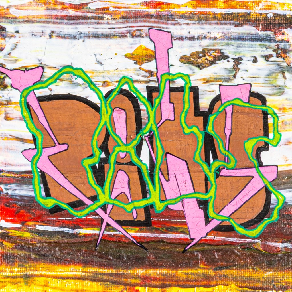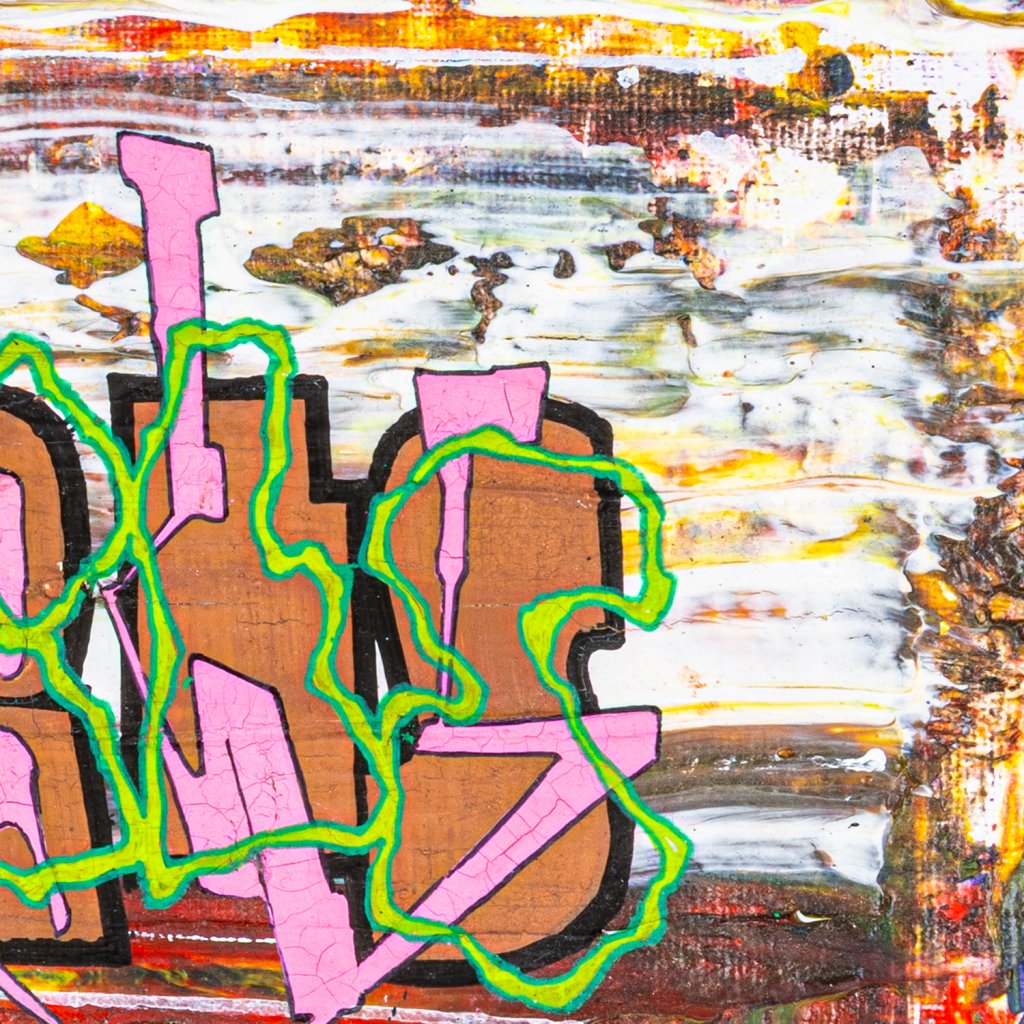 Středobodem kompozice je robustní, hnědý „throw-up“, který tvoří stabilní jádro obrazu. Přes něj jsou však nekompromisně vrstveny další úrovně – růžové ostré linky a svítivě neonový zelený obrys. Tento postup vytváří dojem neustálého přepisování a doplňování, což je proces důvěrně známý z ulic měst. Toto dílo je pro ty, kteří oceňují graffiti v jeho nejčistší formě – jako hru s písmenem a jménem. PiLS zde dokazuje, že i klasický tag může mít hloubku a komplexnost hodnou galerijního prostoru.