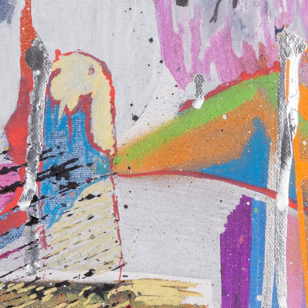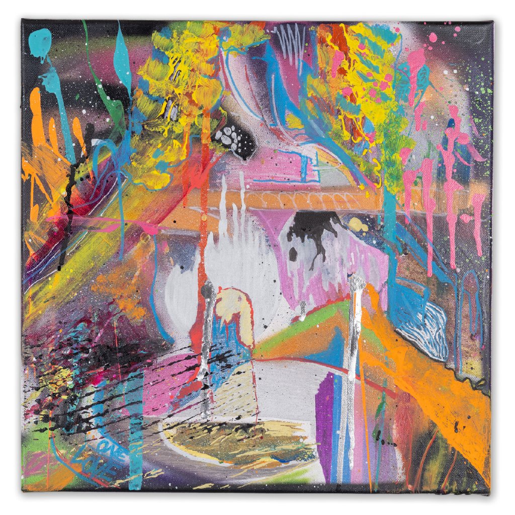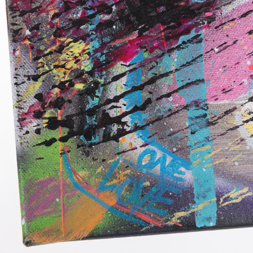 Obrazu dominuje centrální stříbrná záře, která působí jako ohnisko výbuchu, z něhož se do stran rozlévají neonově žluté, oranžové a azurové proudy. V levém dolním rohu se objevuje nápis „ONE LOVE“, odkazující k základním hodnotám hip-hopové kultury.