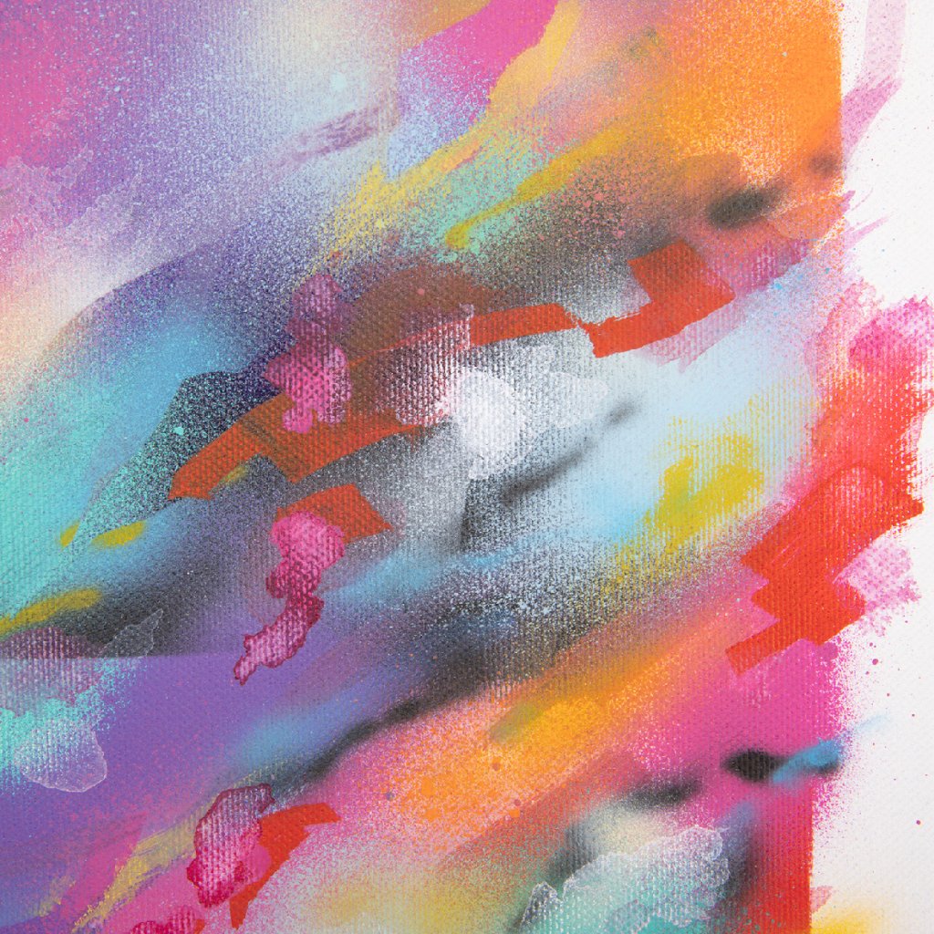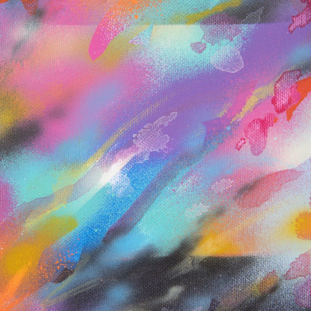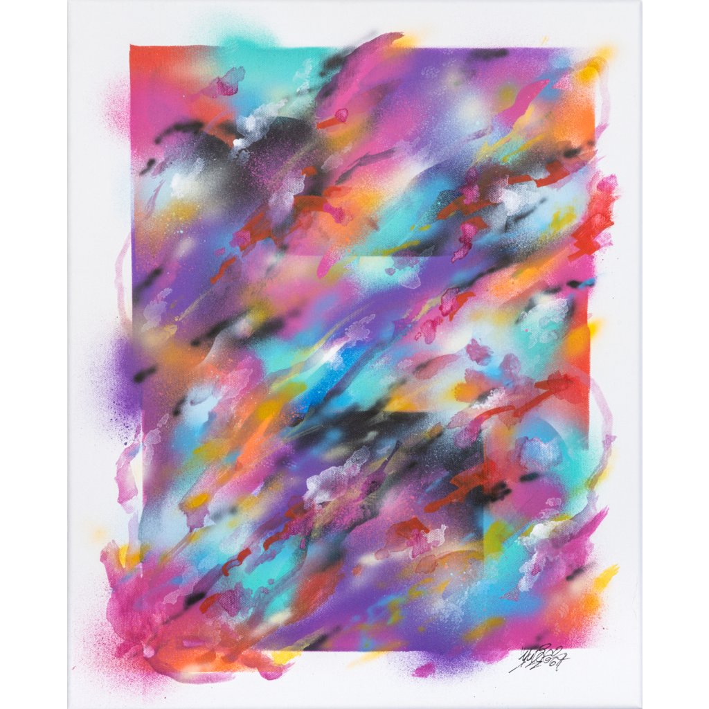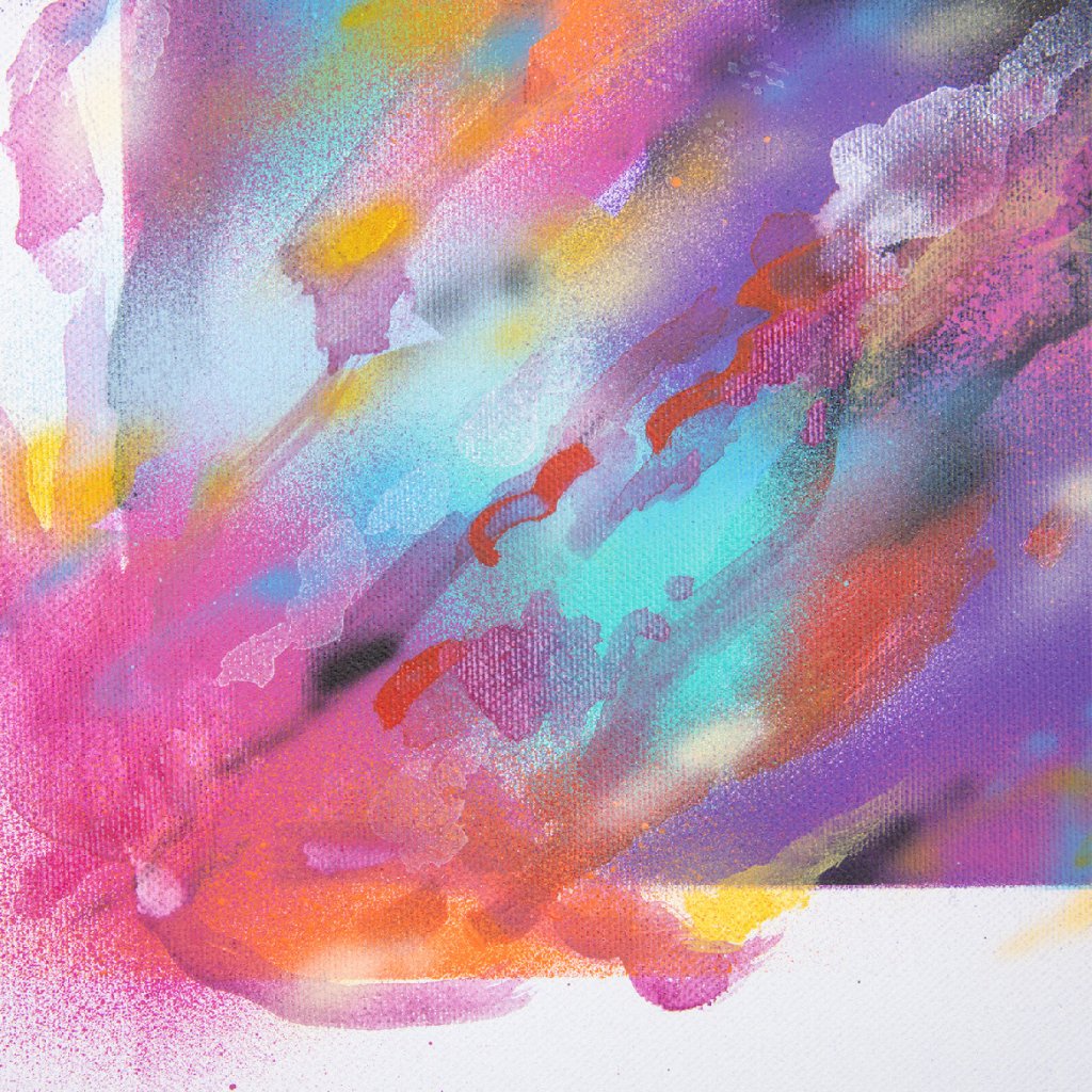 Toto dílo, provedené kombinovanou technikou akrylu a spreje na plátně, evokuje dojem vesmírné mlhoviny, abstraktního portálu nebo okamžiku exploze světla. Exploze barev, tolik charakteristická pro autora, je zde transformována do jemných valérů a vzdušných přechodů, kde se fialová, tyrkysová, růžová a oranžová snoubí v harmonickém, avšak energickém proudu. Autor mistrovsky využívá sprej k vytvoření efektu rozostření a optického pohybu, což dodává plátnu éterický a snový charakter.