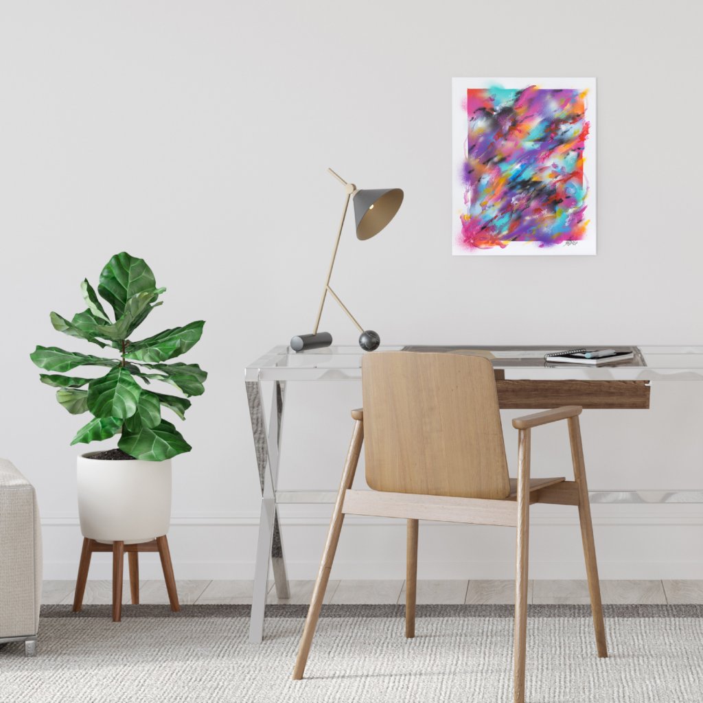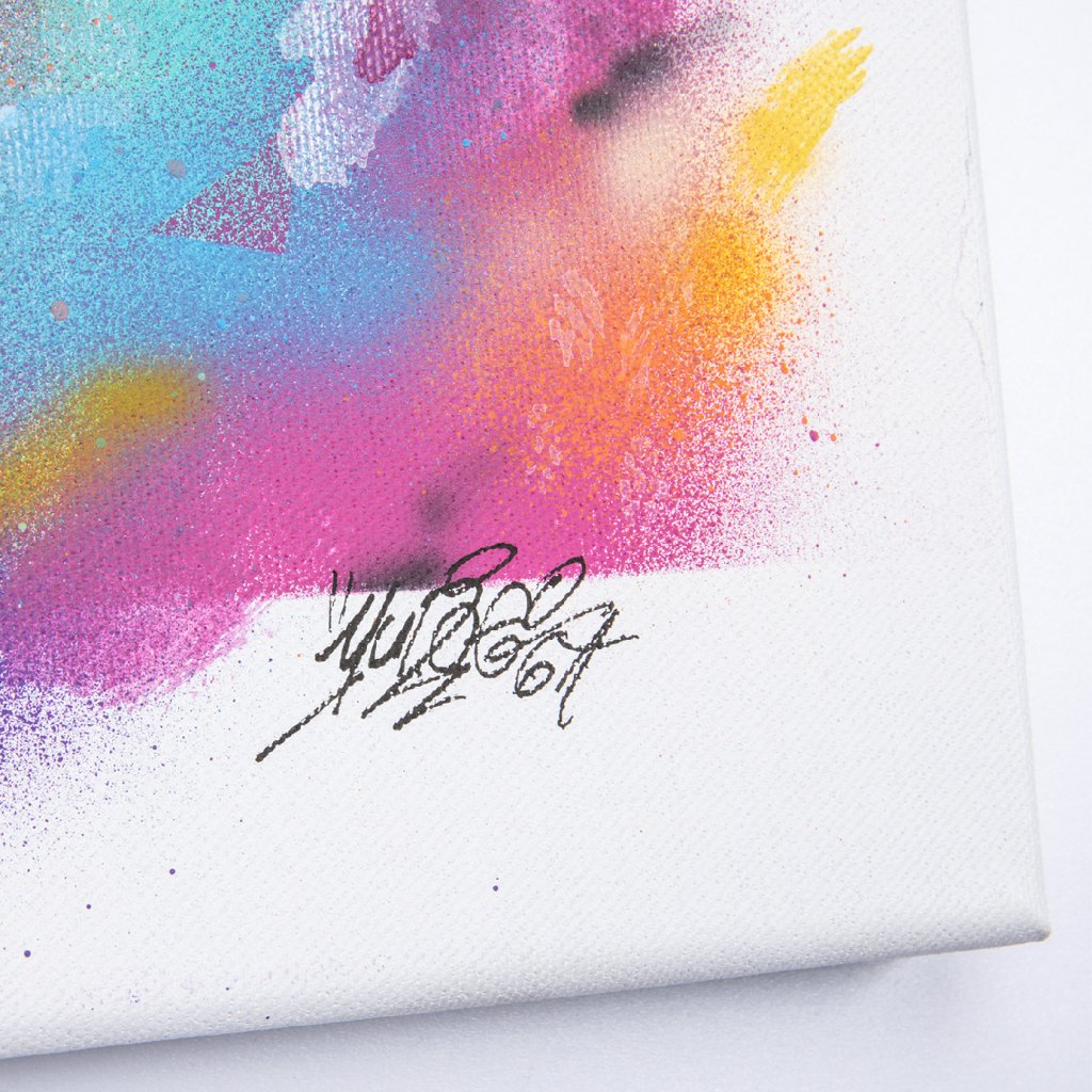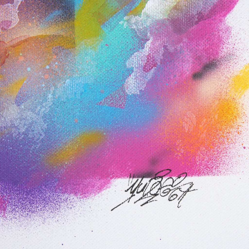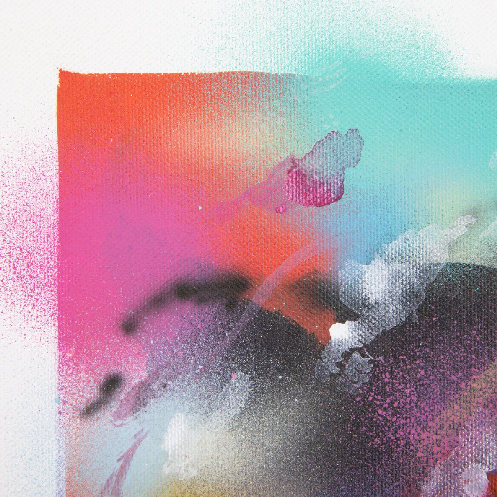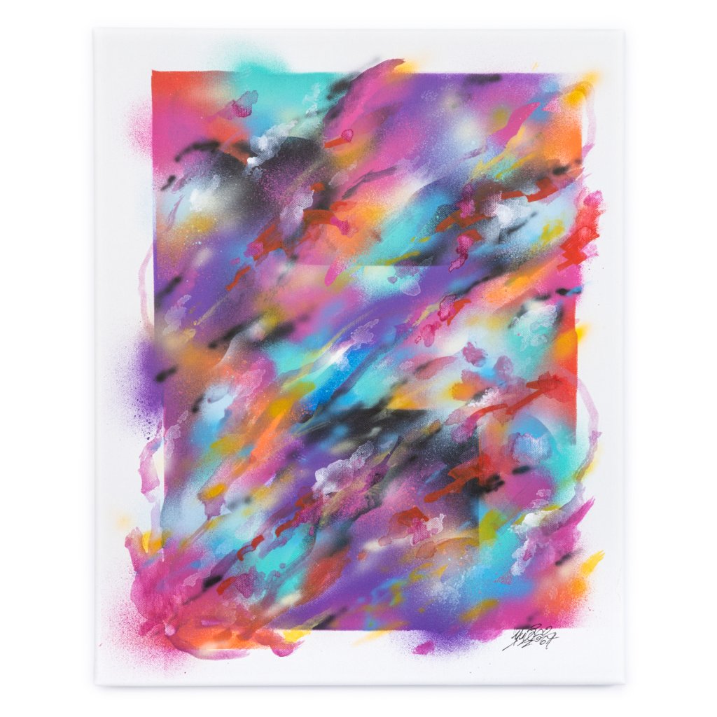Toto dílo, provedené kombinovanou technikou akrylu a spreje na plátně, evokuje dojem vesmírné mlhoviny, abstraktního portálu nebo okamžiku exploze světla. Exploze barev, tolik charakteristická pro autora, je zde transformována do jemných valérů a vzdušných přechodů, kde se fialová, tyrkysová, růžová a oranžová snoubí v harmonickém, avšak energickém proudu. Autor mistrovsky využívá sprej k vytvoření efektu rozostření a optického pohybu, což dodává plátnu éterický a snový charakter.
