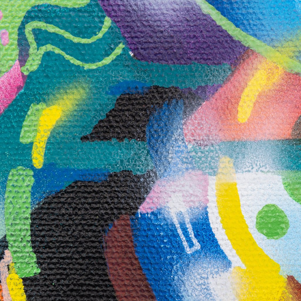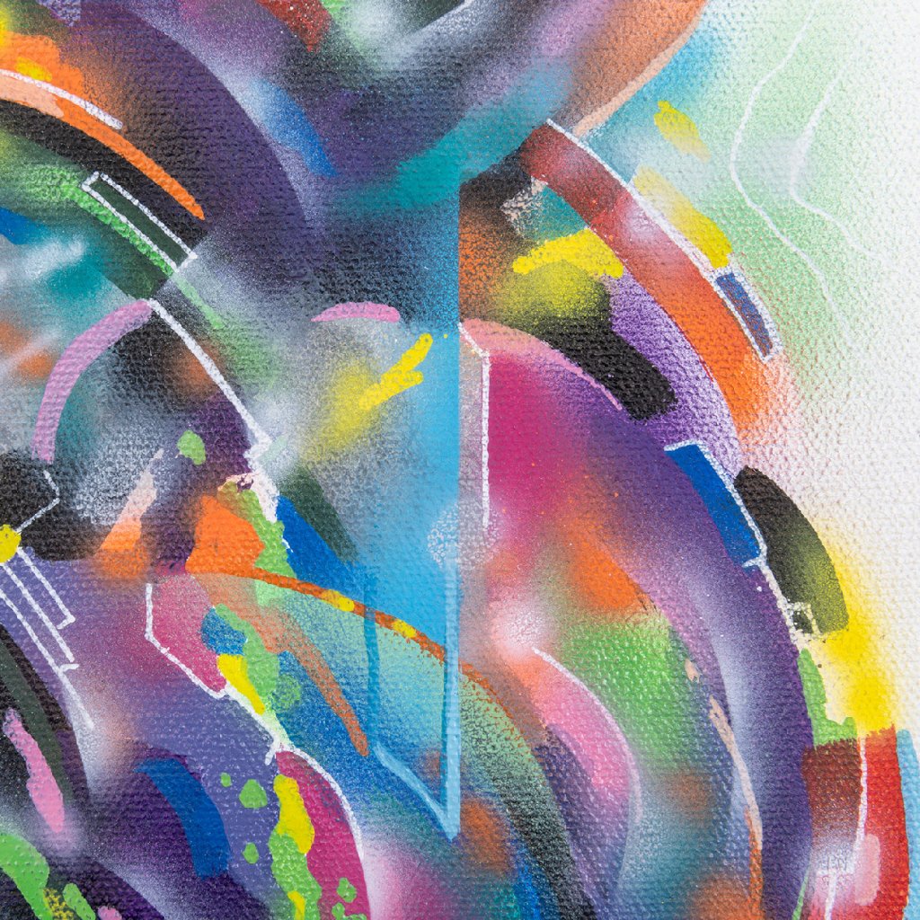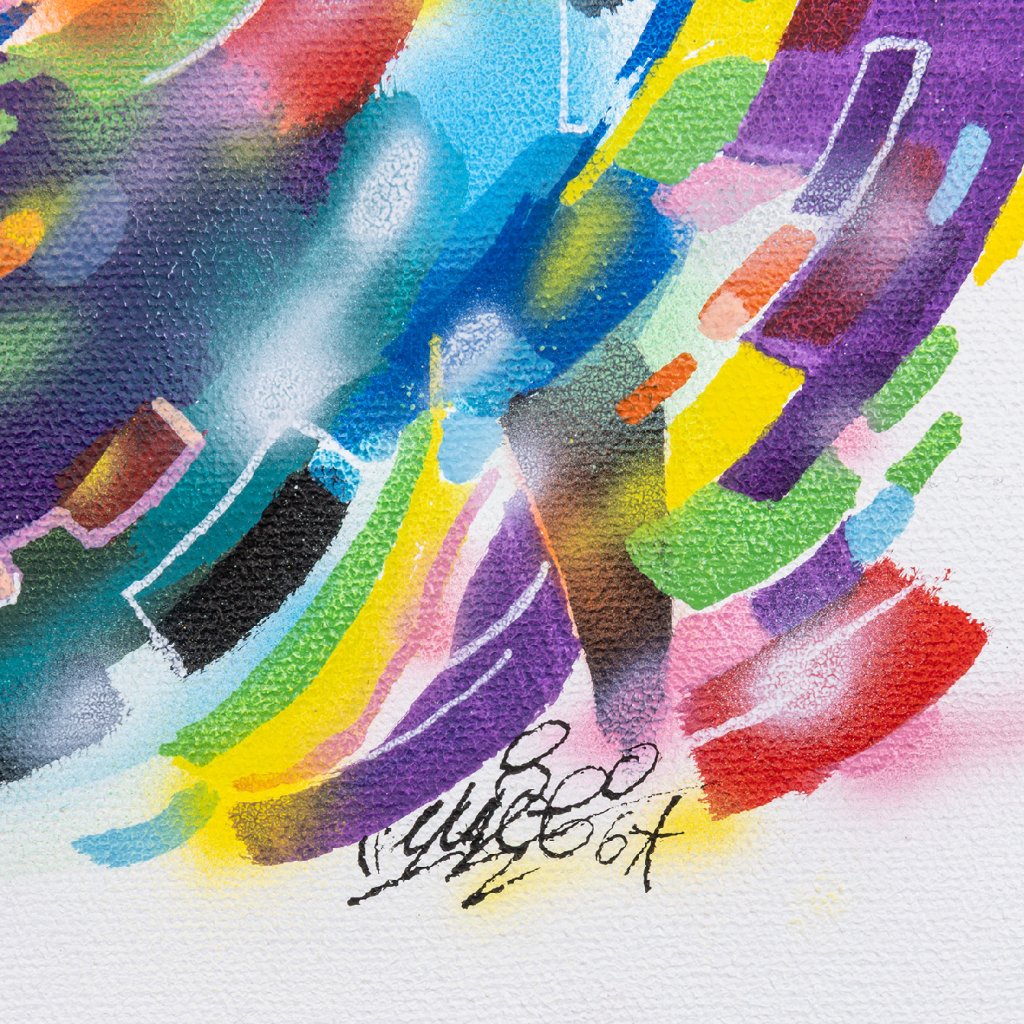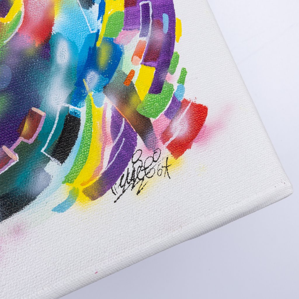 Dílo „G“ je fascinujícím ztělesněním vizuální energie a komplexnosti, která je charakteristická pro tvorbu YUDOE 06. Tato dynamická malba, provedená kombinovanou technikou akrylu a spreje na plátně, představuje archetypální příklad jeho práce s explozí barev a propracovanými kompozicemi, jež se staly jeho poznávacím znamením ve veřejném i galerijním prostoru.