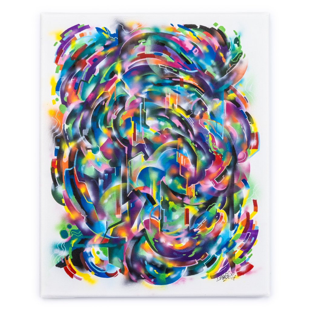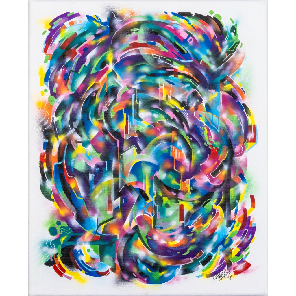 „G“ je manifestem dynamiky a pohybu, kde se linie a segmenty zdánlivě vlní a víří, jako by zachycovaly moment nekonečného toku energie. Toto plátno je ztělesněním autorovy fascinace barevnými kombinacemi, stroji a mechanismy, i když zde převedené do abstraktní, téměř hypnotické formy. Odkazuje na jeho kořeny v graffiti a street artu, ale zároveň posouvá tyto vlivy do roviny contemporary artu, kde je forma stejně důležitá jako samotná technika provedení.