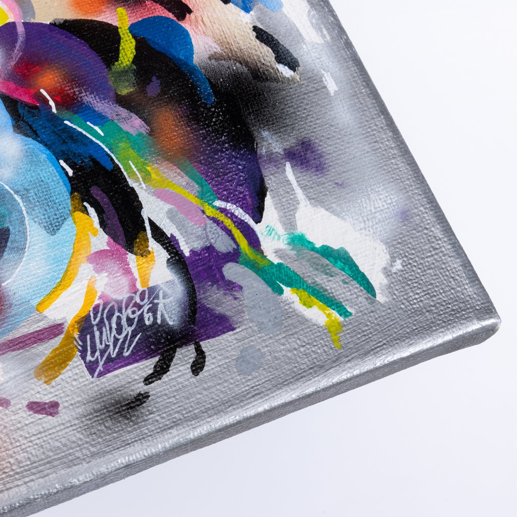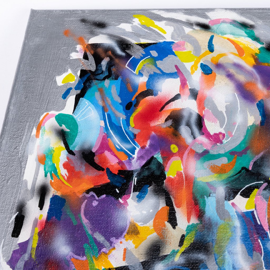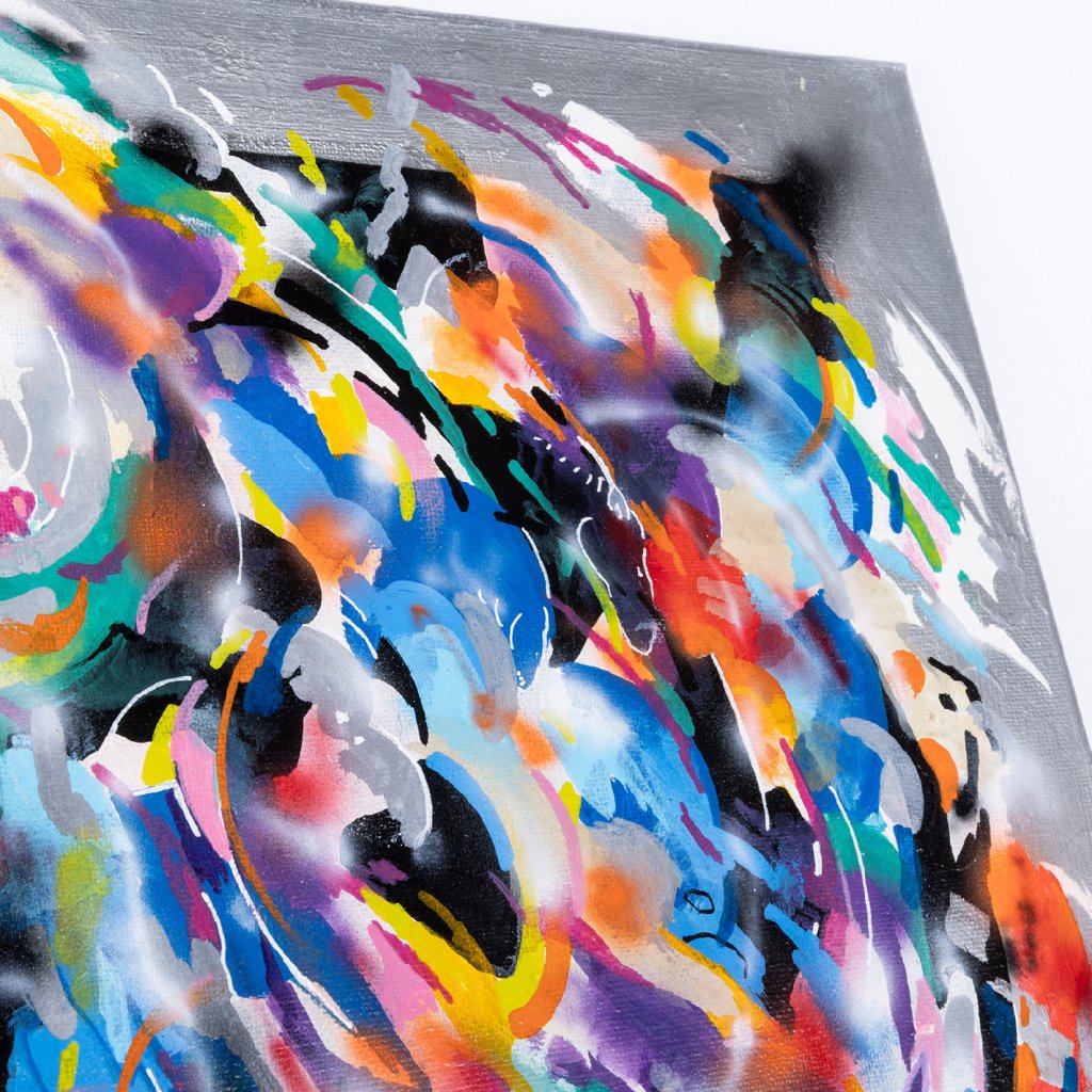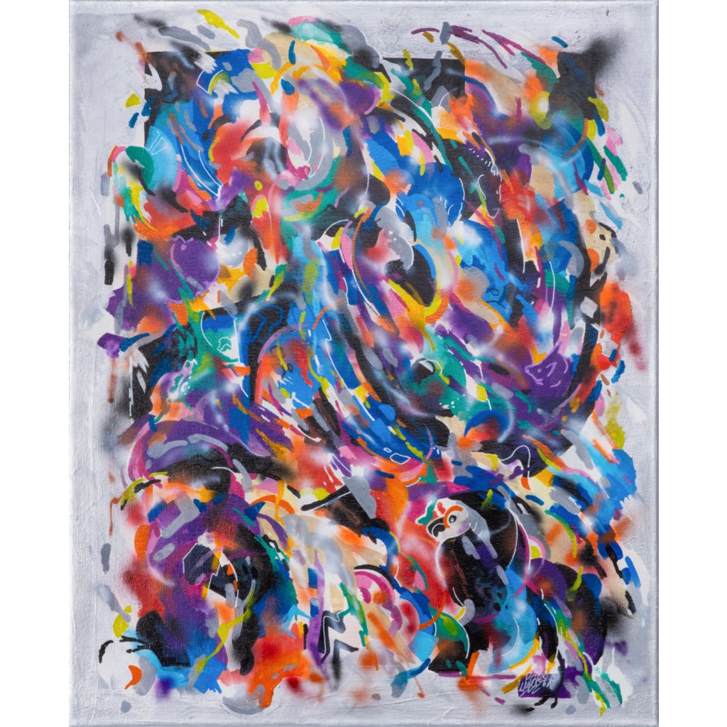 Dílo „R“ je ukázkovým příkladem nezkrotné energie a exploze barev, které definují malířský rukopis YUDOE 06. Tato dynamická abstraktní malba je hlubokým ponorem do autorovy fascinace barevnými kombinacemi a pohybem, a zároveň zjevným odkazem na jeho kořeny v graffiti a street artu.
