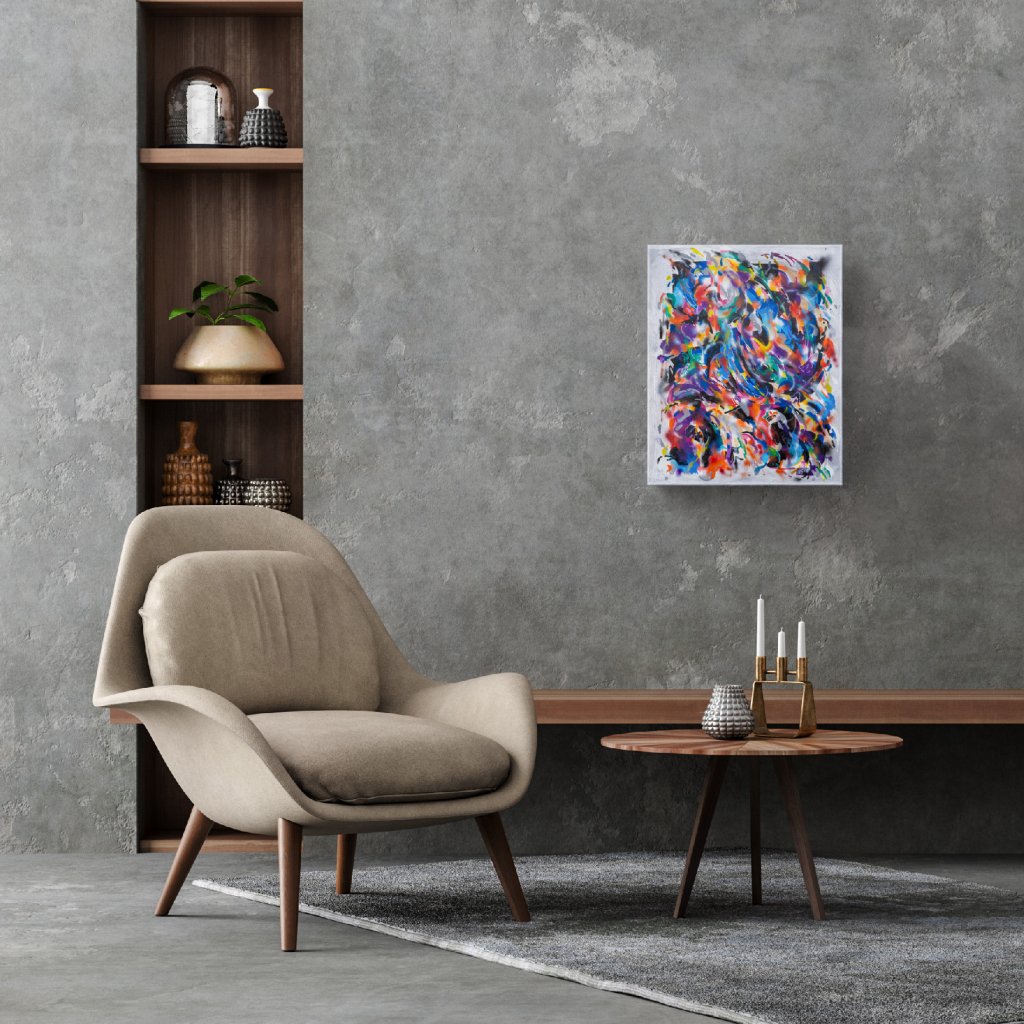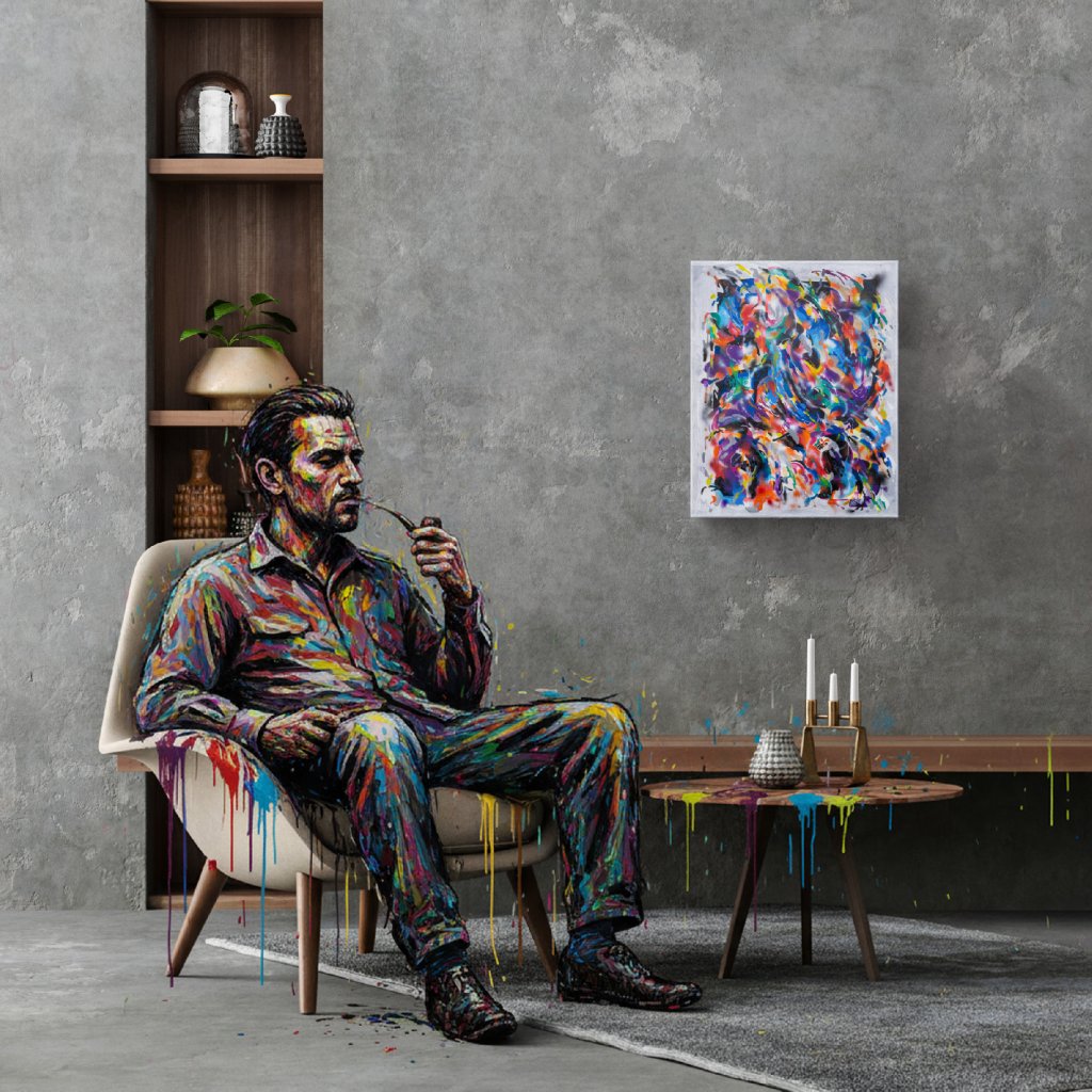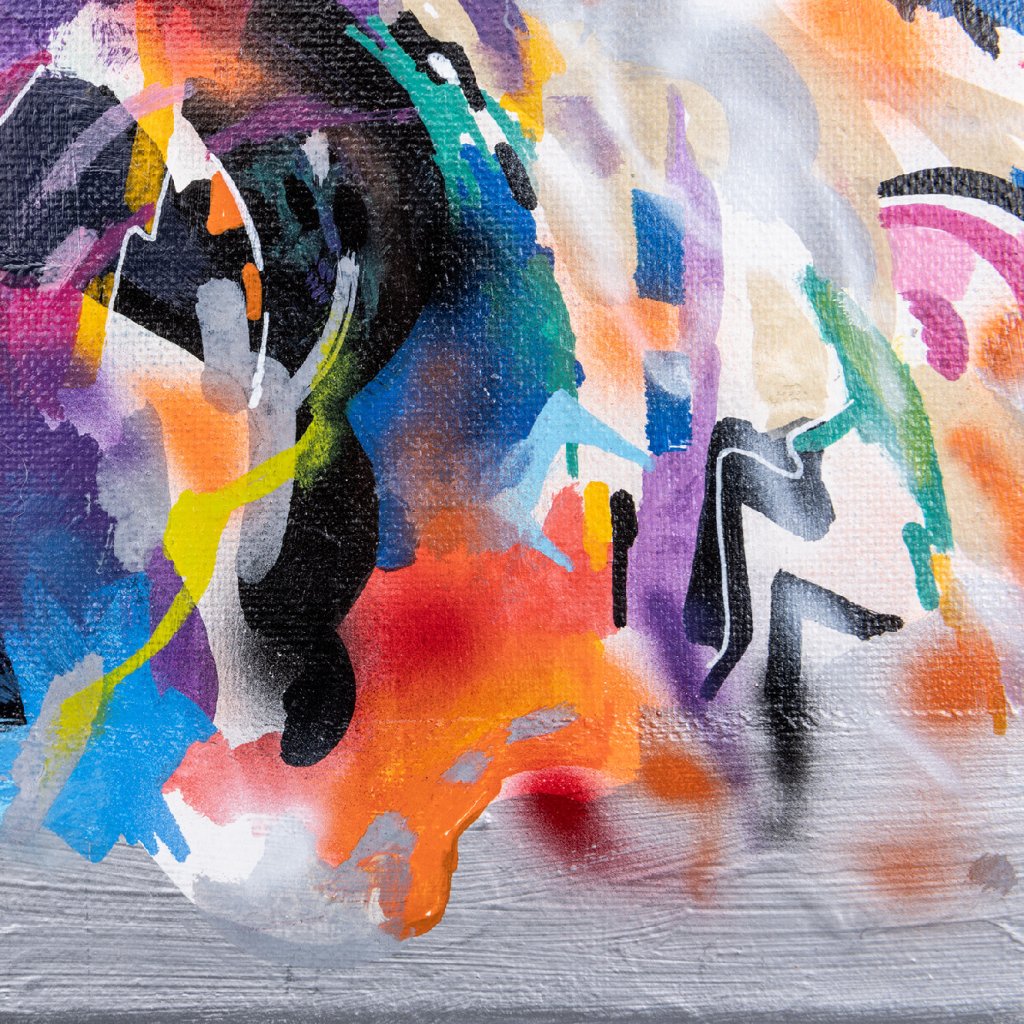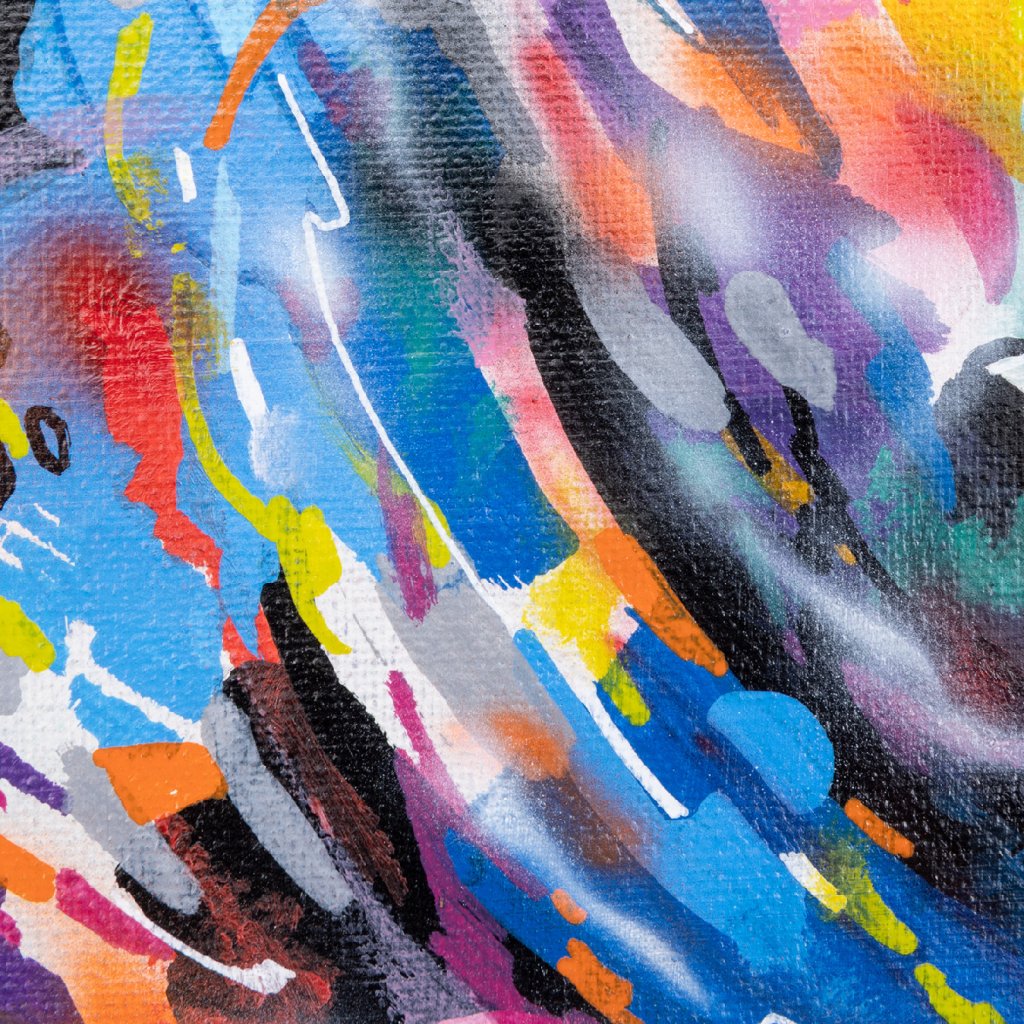 Dílo „R“ je ukázkovým příkladem nezkrotné energie a exploze barev, které definují malířský rukopis YUDOE 06. Tato dynamická abstraktní malba je hlubokým ponorem do autorovy fascinace barevnými kombinacemi a pohybem, a zároveň zjevným odkazem na jeho kořeny v graffiti a street artu.