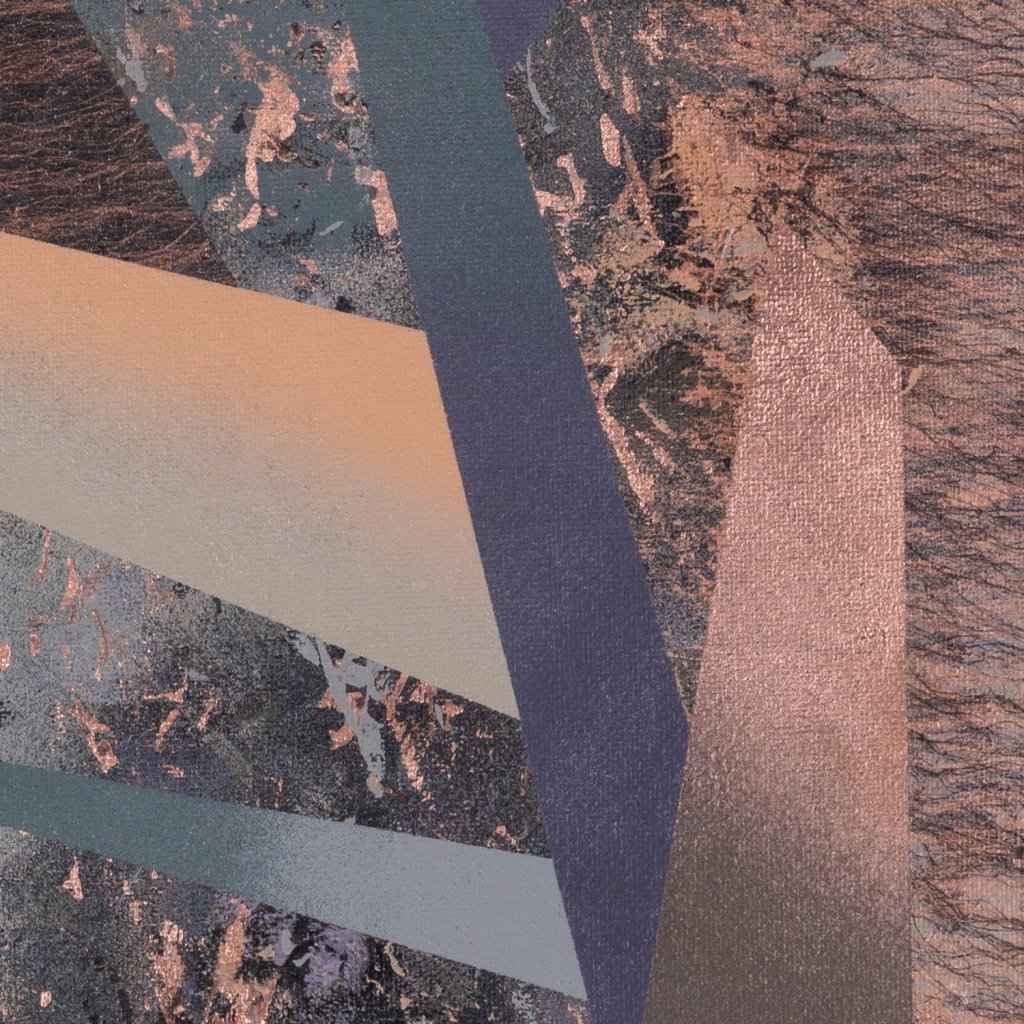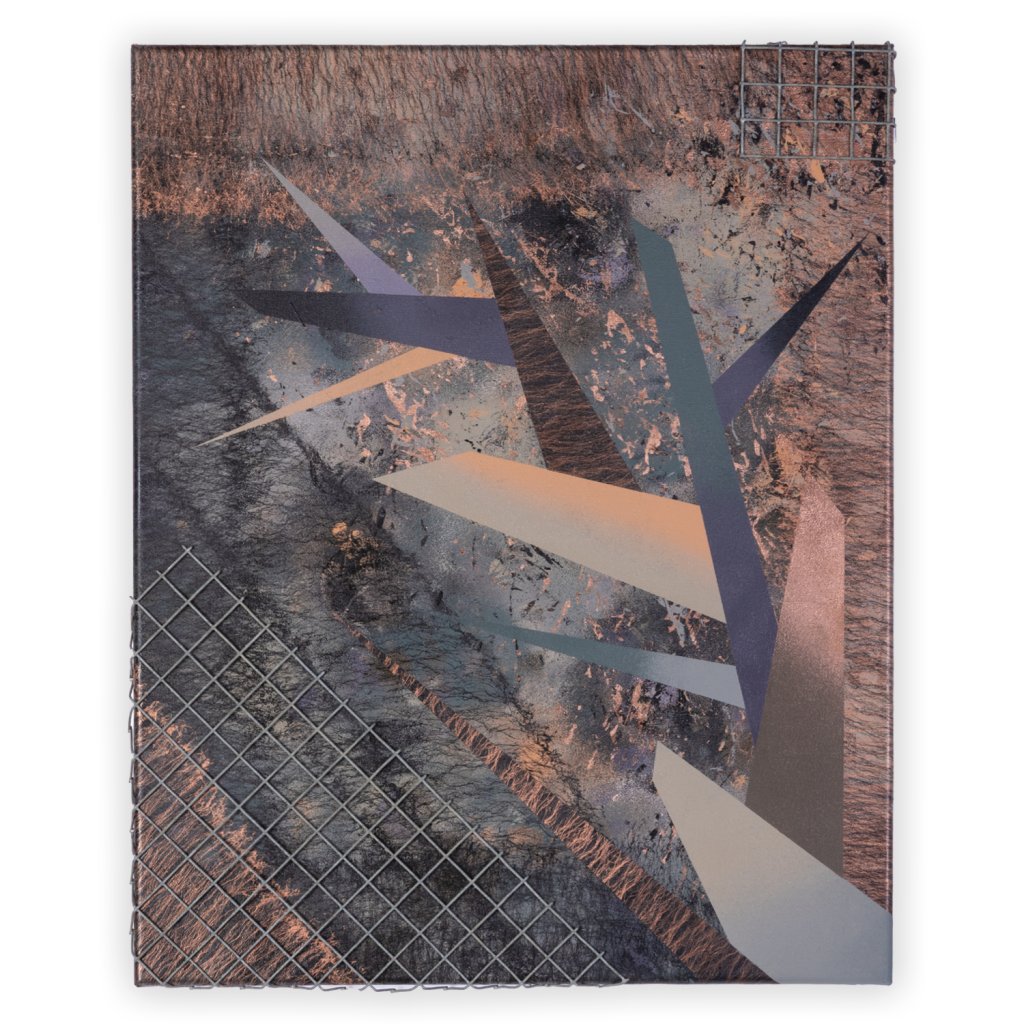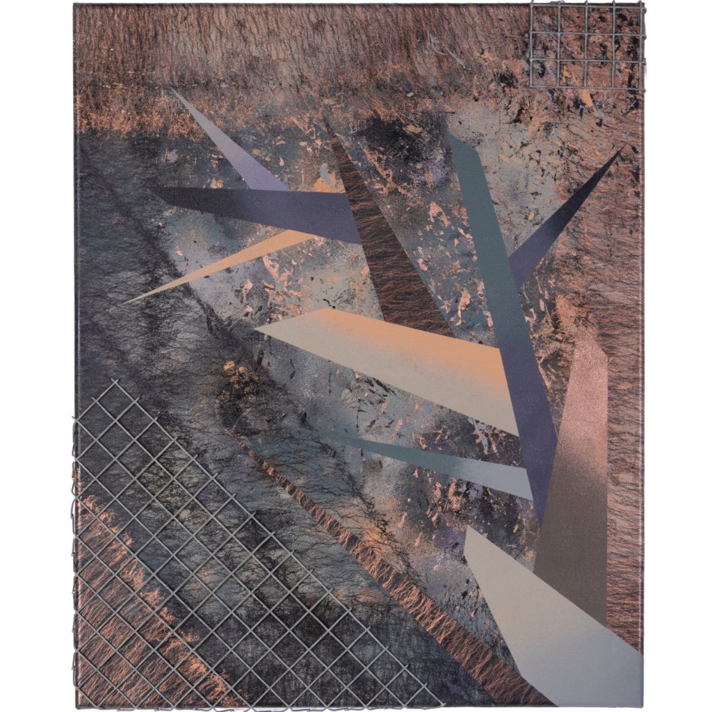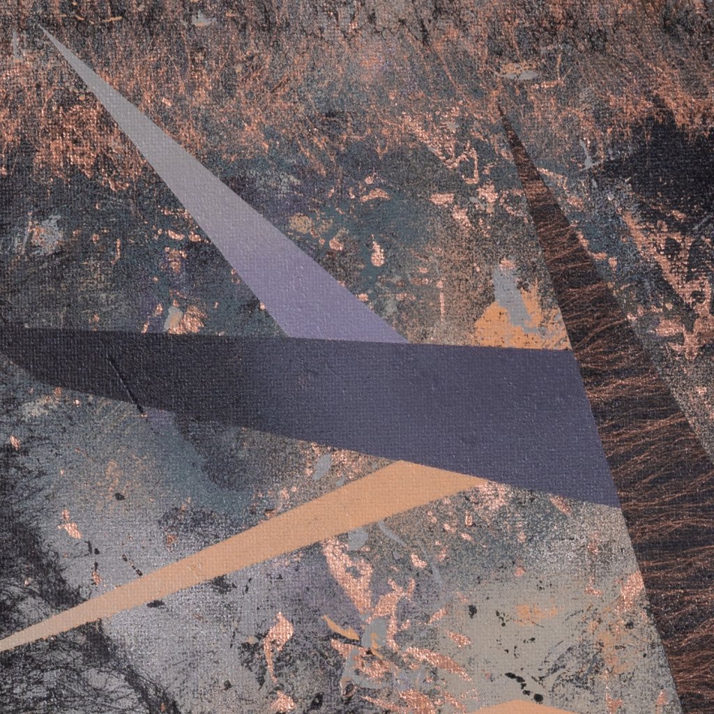 Pozadí je tvořeno bohatou, roztříštěnou texturou, kde se prolínají tmavě šedé, purpurové a měděné odstíny. Tento hluboký, metalický podklad je narušen ostrými, geometrickými útvary, které se dynamicky protínají a směřují vzhůru. Tyto tvary – provedené v matných barvách jako jsou odstíny béžové, šedofialové a tmavě zelené – vytvářejí v kompozici napětí a připomínají krystalické struktury, střepy nebo futuristické architektonické prvky.
