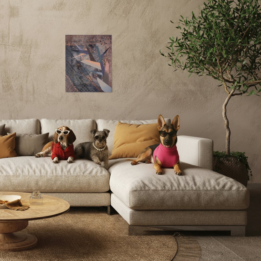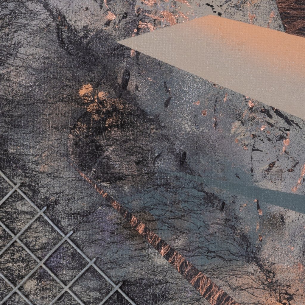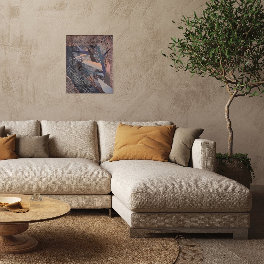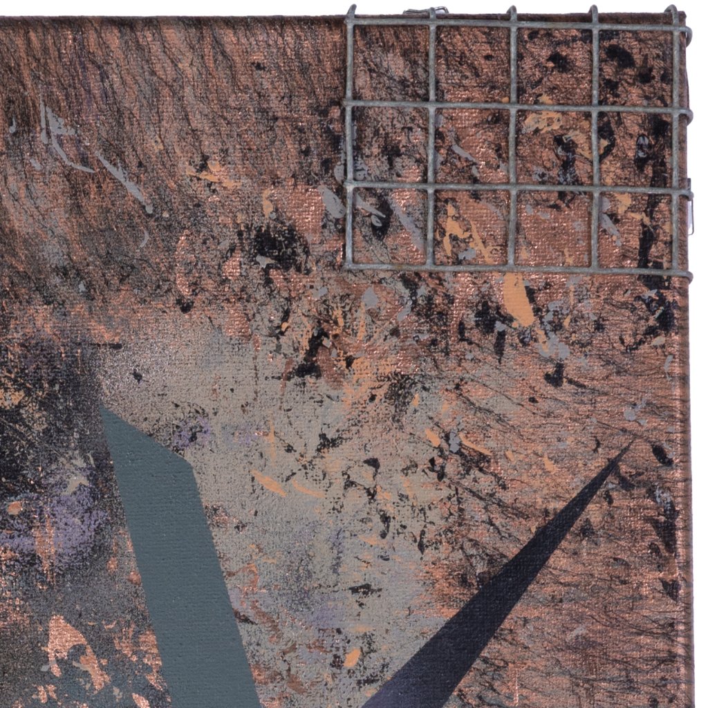 Pozadí je tvořeno bohatou, roztříštěnou texturou, kde se prolínají tmavě šedé, purpurové a měděné odstíny. Tento hluboký, metalický podklad je narušen ostrými, geometrickými útvary, které se dynamicky protínají a směřují vzhůru. Tyto tvary – provedené v matných barvách jako jsou odstíny béžové, šedofialové a tmavě zelené – vytvářejí v kompozici napětí a připomínají krystalické struktury, střepy nebo futuristické architektonické prvky.