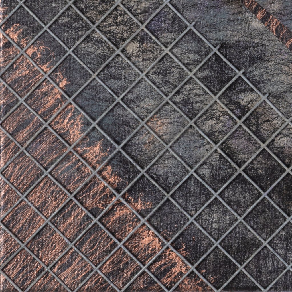 Klíčovým prvkem je použití reliéfních prvků v podobě drátěného pletiva. Velká část plátna v levé dolní části je pokryta mřížkou, která vizuálně dělí obraz a evokuje témata omezení, bariér nebo síťového propojení. Menší sekce mřížky se nachází i v pravém horním rohu, čímž vytváří balanc a zdůrazňuje kontrast mezi chaotickým pozadím a řádovou strukturou.