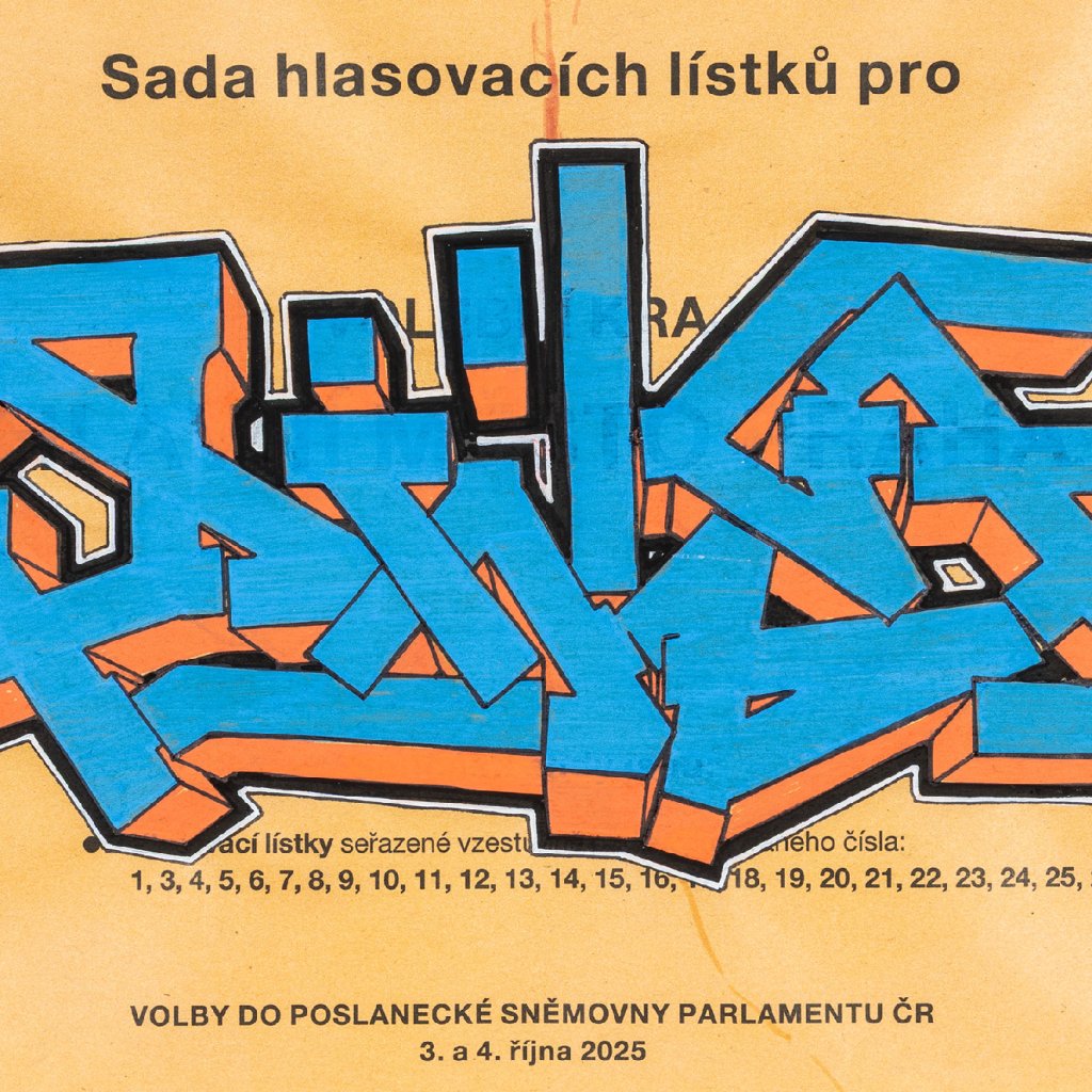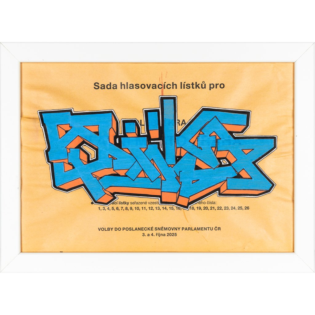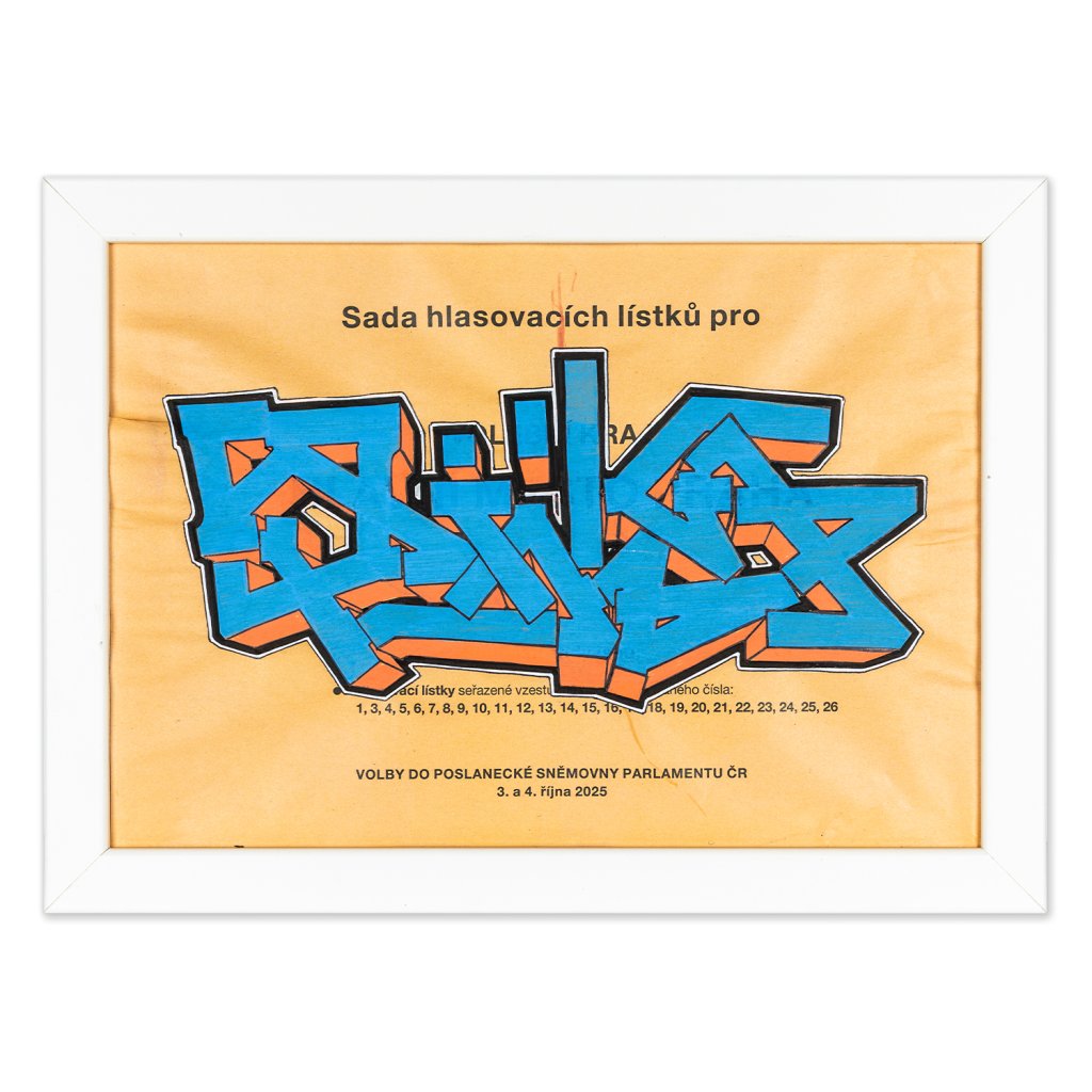 Dílo „Volební obálka“ je trefným komentářem k prorůstání street artu do veřejného a politického prostoru. Autor jako podklad využil autentickou úřední obálku k volbám do Poslanecké sněmovny ČR, čímž vytváří ostrý kontrast mezi strohým státním aparátem a nespoutanou kulturou graffiti.