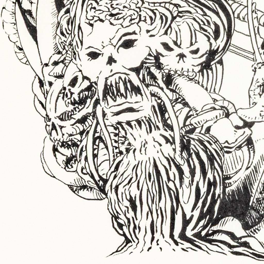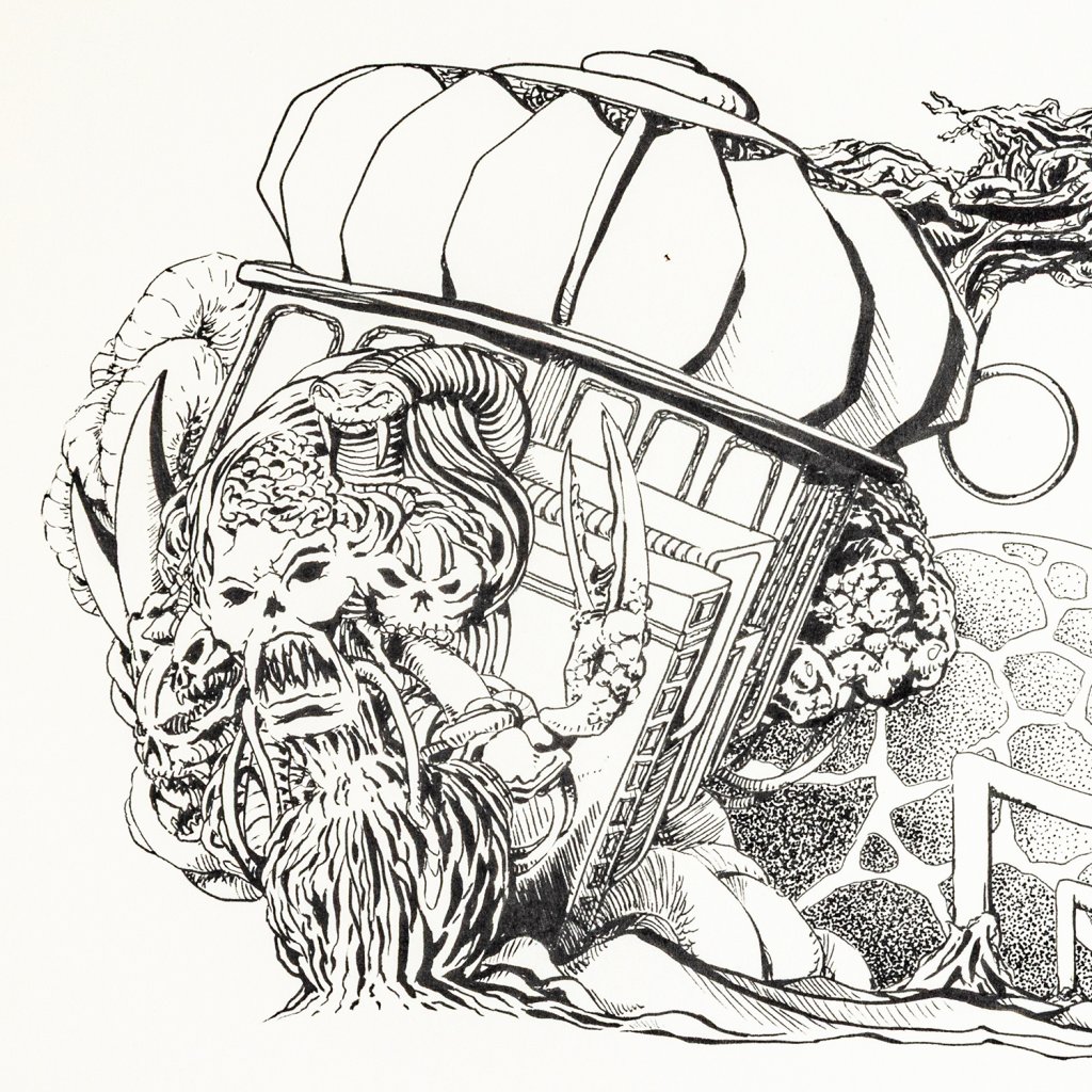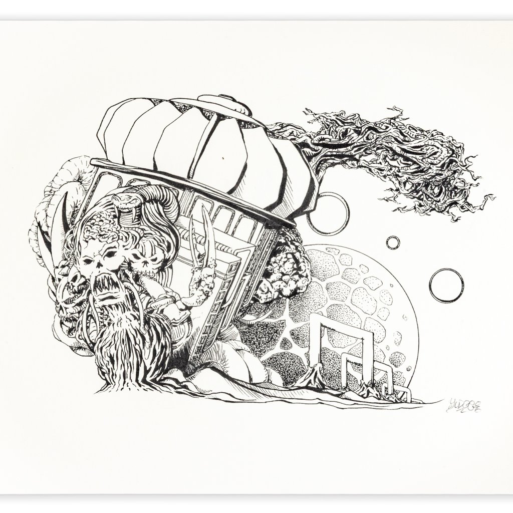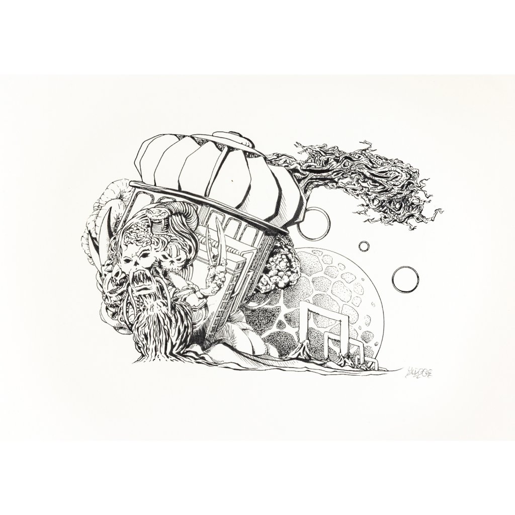 Dílo zachycuje kosmického strážce nebo pradávného ducha, který je doslova prorostlý se strojem – zjevně s klasickou telefonní budkou (motiv často spojený se sci-fi, jako brána do jiných dimenzí). Tvář postavy je plná detailů, s vlnící se bradkou a vlasy, které plynule přechází v organické kořeny nebo chapadla, evokující jeho zájem o tvary anorganické a organické přírody.