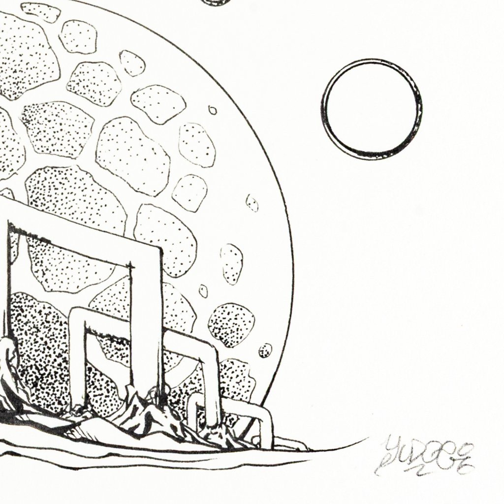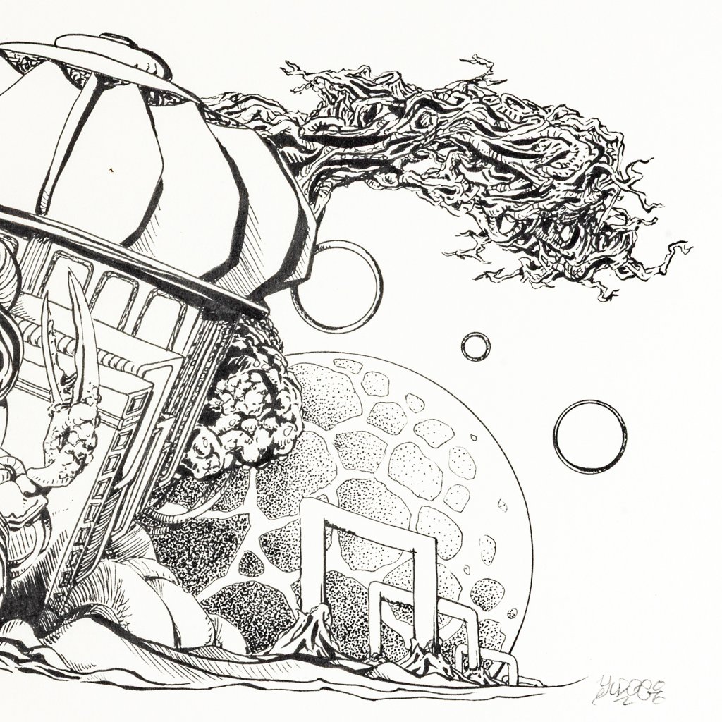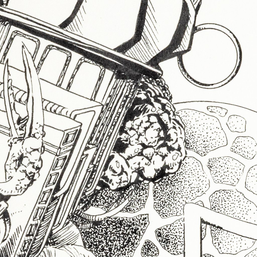 Celá scéna je zasazena do snového, kosmického prostředí s dominantním měsíčním tělesem, zobrazeným precizním tečkováním (stipple), které vytváří zajímavý kontrast k hustému šrafování na centrální postavě. Tento detailní kontrast textur a objemů je ukázkou autorovy grafické zručnosti a jeho hledačství v možnostech černobílé linky.