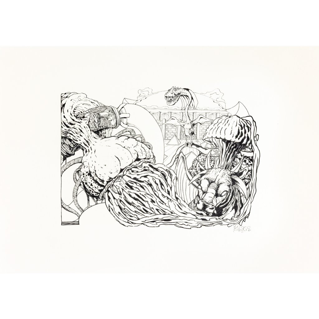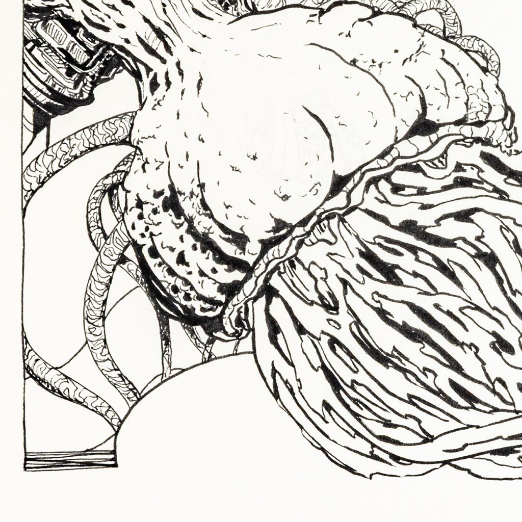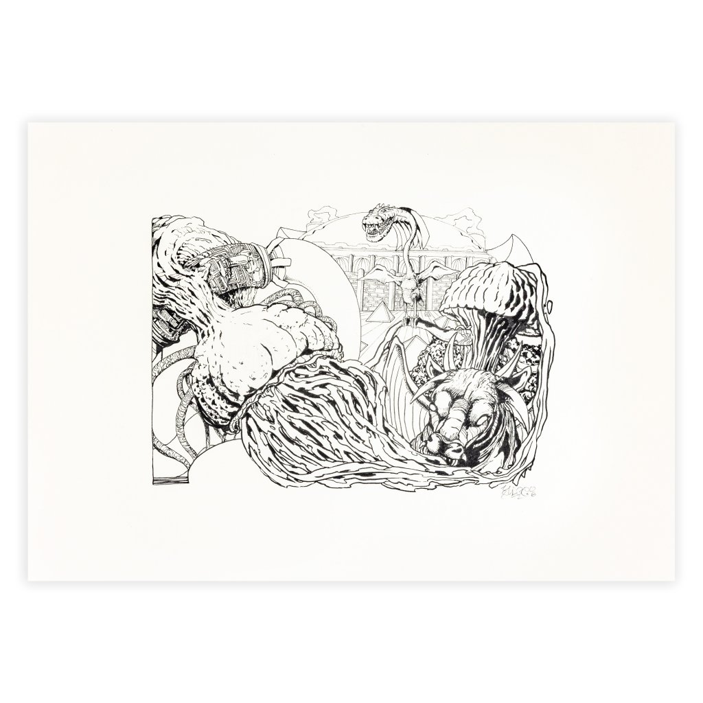 Tisk na Munken Pure 300g papíře. Vytištěn pouze 1ks. Signováno tužkou. Dílo „Mecha Mutants Island“ je intenzivním vizuálním manifestem, který stojí na pomezí klasické figurativní kresby, sci-fi komiksu a expresivní detailní narace. Yudoe 06 zde prezentuje svůj mistrný tah perem. Charakteristickým prvkem je vysoká technická preciznost, s níž autor vytváří husté, organické textury a stínování.