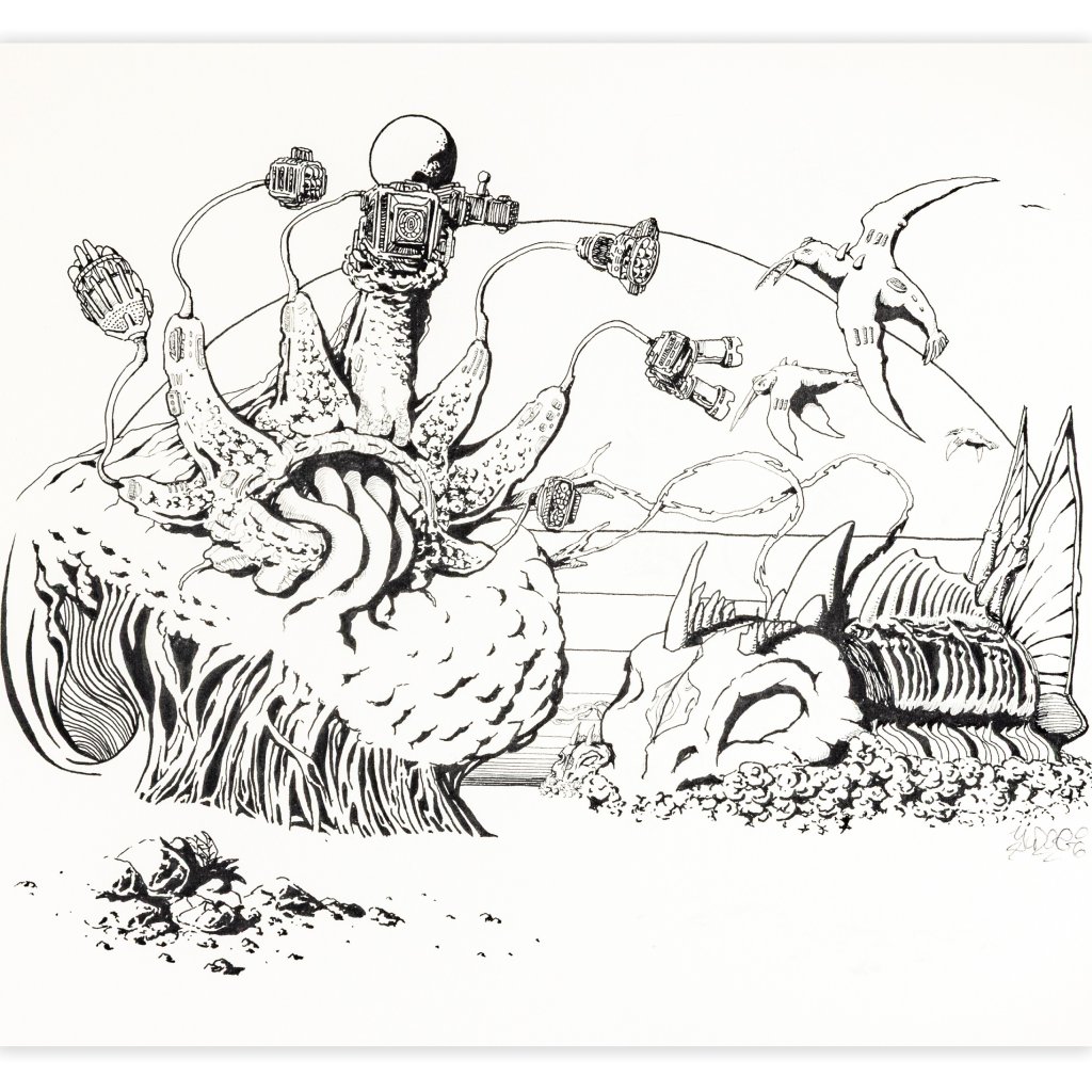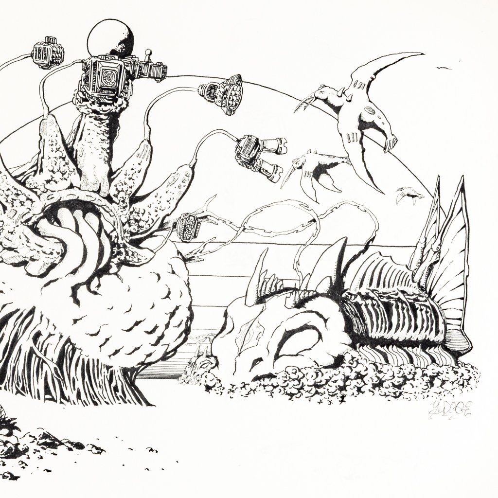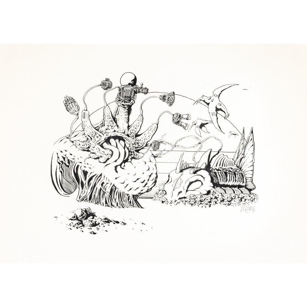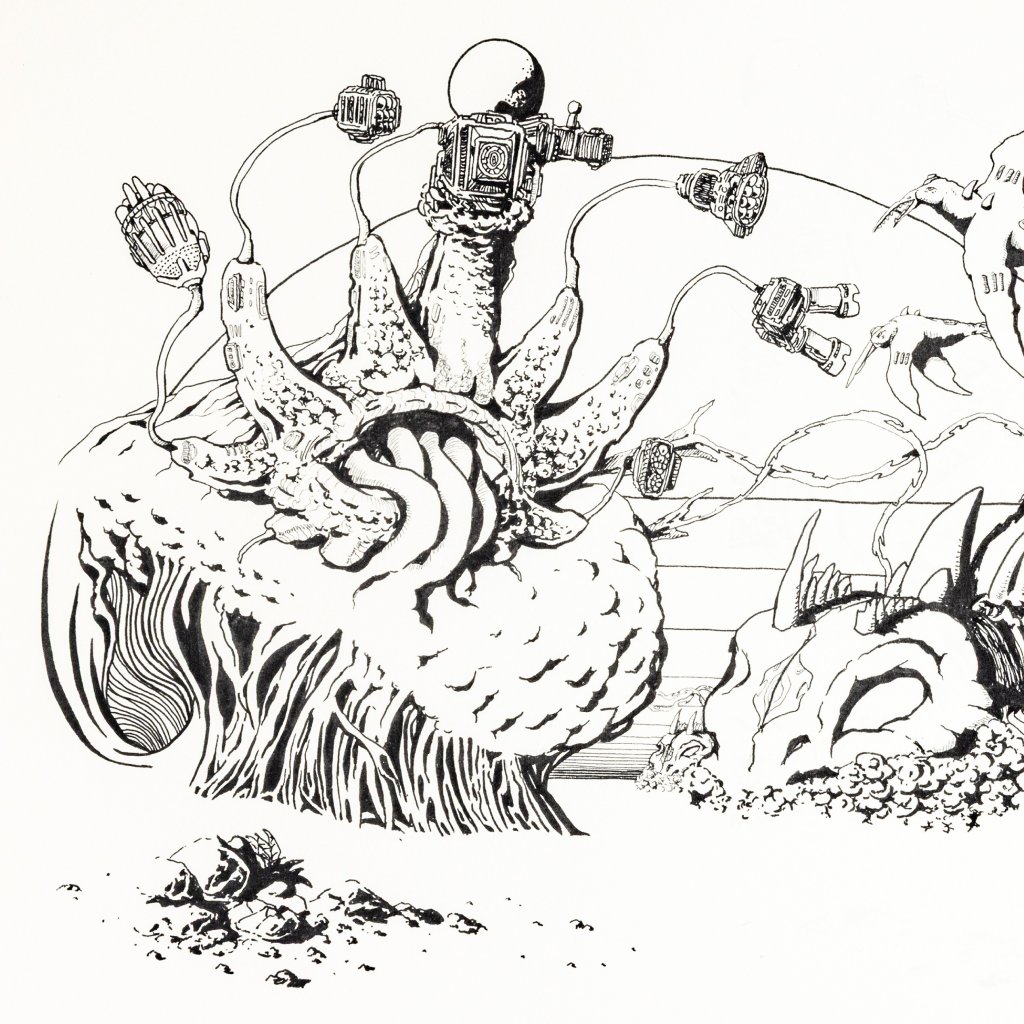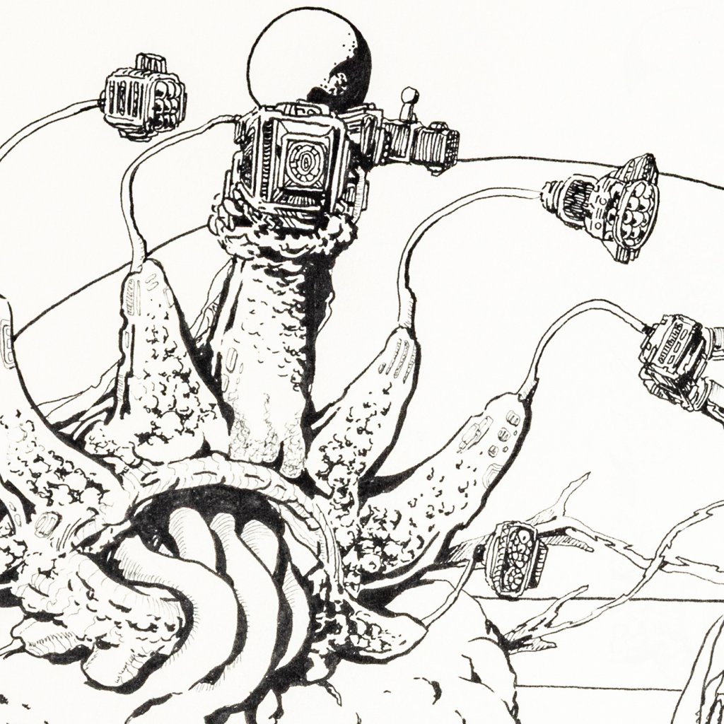 Dílo rezonuje s jeho dlouhodobou fascinací komiksem, stroji a mechanismy a organickou i anorganickou přírodou. Vidíme zde jakýsi bio-mechanický organismus nebo stvoření, které se zdá být zakořeněné v postapokalyptické krajině, s chapadly osázenými kamerovými objektivy. Tento motiv reflektuje prvky surrealismu a science fiction, a zároveň odhaluje autorovu schopnost proměnit myšlenkové proudy v detailní, vizuálně propracovanou formu.
