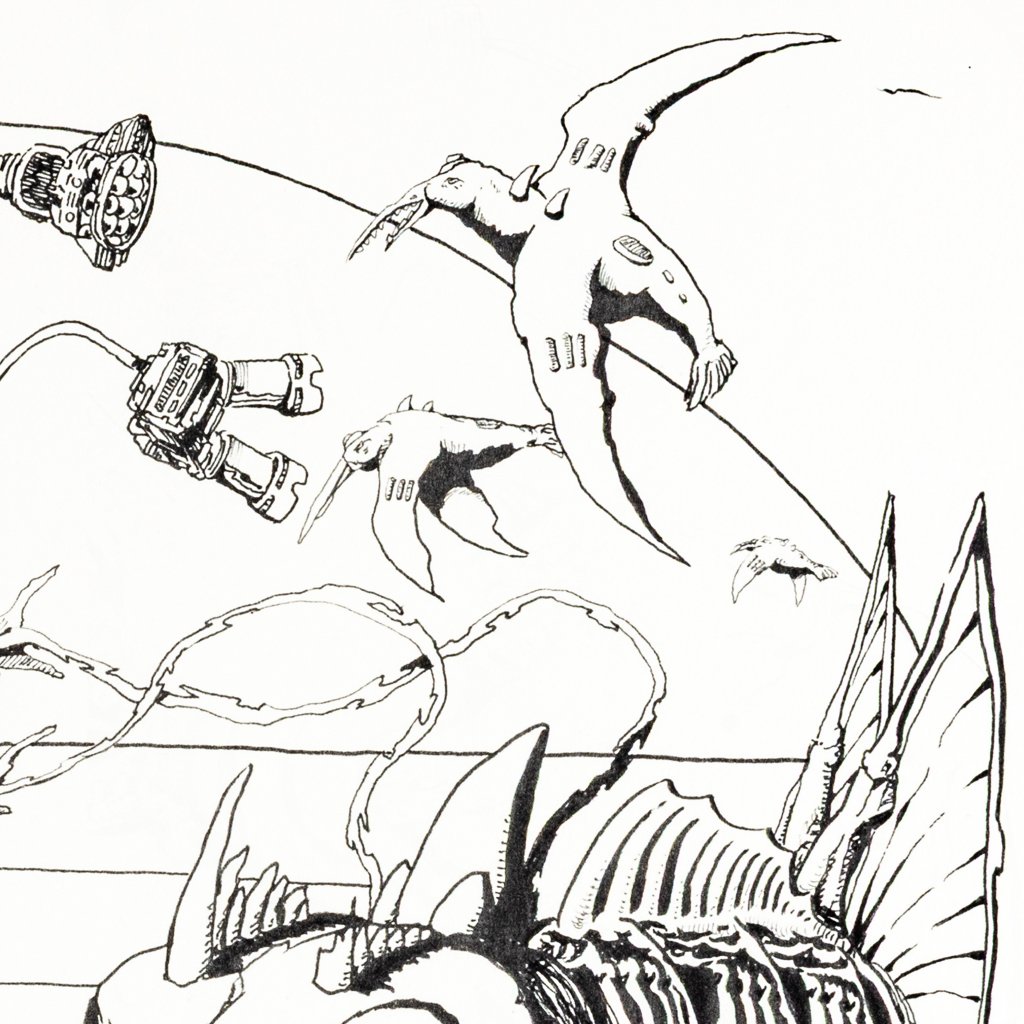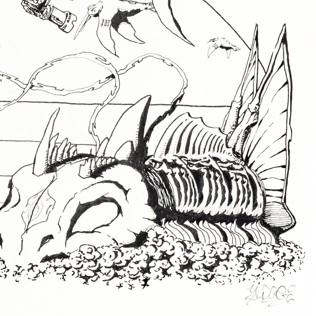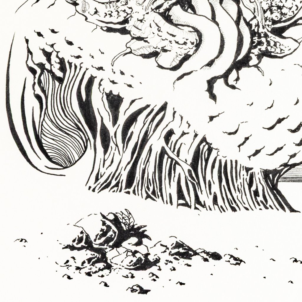 Tisk na Munken Pure 300g papíře. Vytištěn pouze 1ks. Signováno tužkou. Tento černobílý tisk nás zavádí do hlubin fantastického světa Zlbe, kde se organické tvary prolínají s futuristickými technologiemi, což je typické pro tvorbu YUDOE 06. Umělec, který je veřejnosti znám především díky svým explozivně barevným muralům, zde ukazuje mistrné zvládnutí precizní inkoustové kresby.