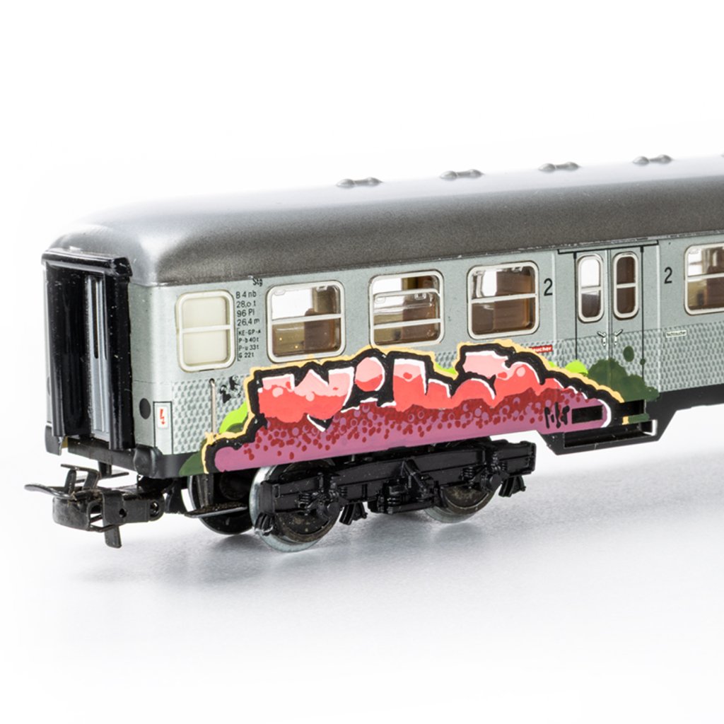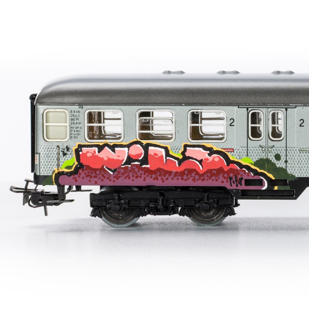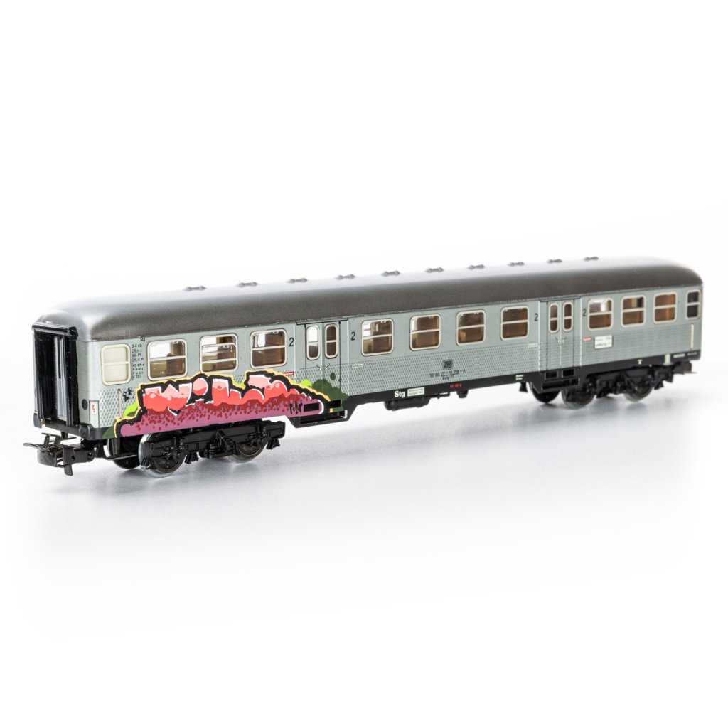 Tento sběratelský kovový model, který měří 24cm představuje naprosto výjimečné spojení precizního německého modelářství a autentického graffiti. Jedná se o limitovaný první kus ze speciální série graffiti vlaků, jehož základem je robustní celokovový osobní vagón 2. třídy Deutsche Bahn (DB) od legendární značky Märklin v měřítku H0.