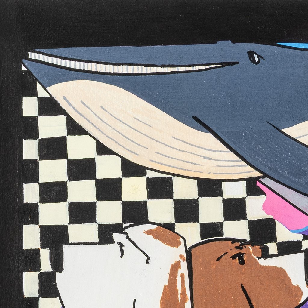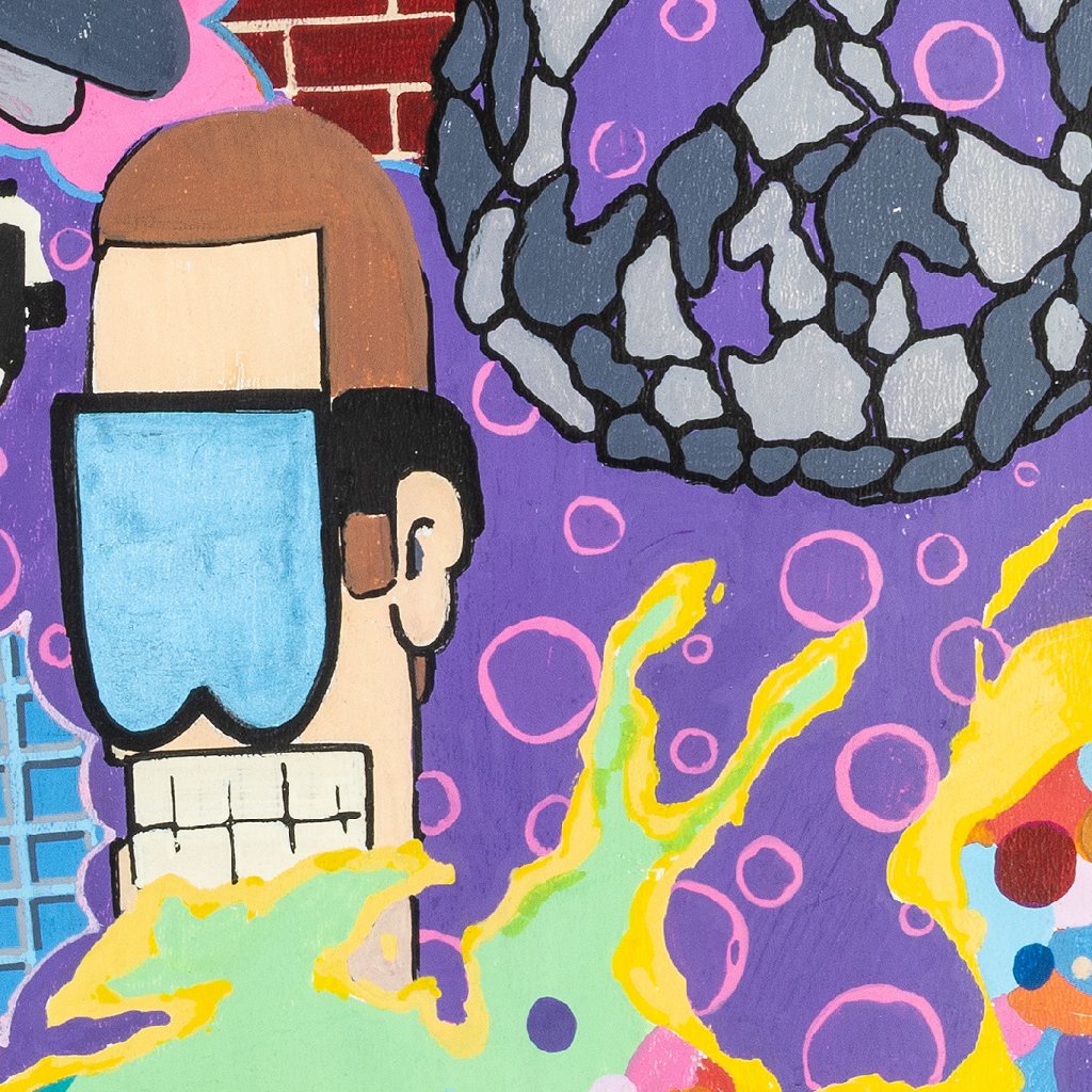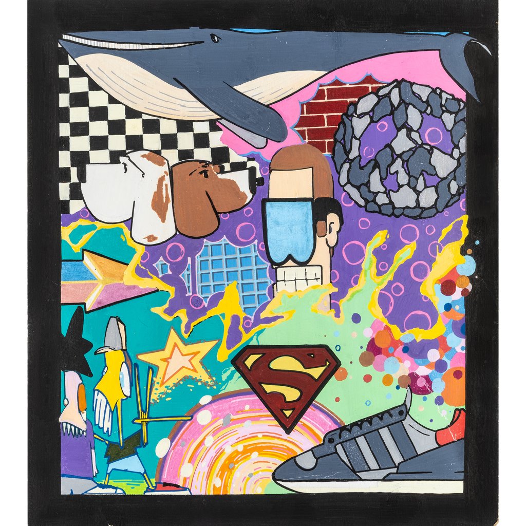 Najdeme zde vše od přírodních motivů (velryba) přes klasické graffiti postavičky (charaktery) až po globální symboly jako logo Supermana nebo ikonickou tenisku. Nechybí ani klasické streetartové prvky jako šachovnice, cihlová zeď nebo komiksové bubliny. Volba sololitu jako podkladu dodává dílu specifickou pevnost. Práce fixem je zde dovedena do ilustrátorské dokonalosti – barvy jsou jasně oddělené, kontury ostré a celé dílo působí velmi čistým, téměř tištěným dojmem, přestože jde o ruční práci. Černý rámovací okraj, který je součástí malby, koncentruje dění uvnitř obrazu a dodává mu charakter „okna“ do autorovy mysli. Je to vizuální encyklopedie stylu, která baví svou barevností i hravostí.