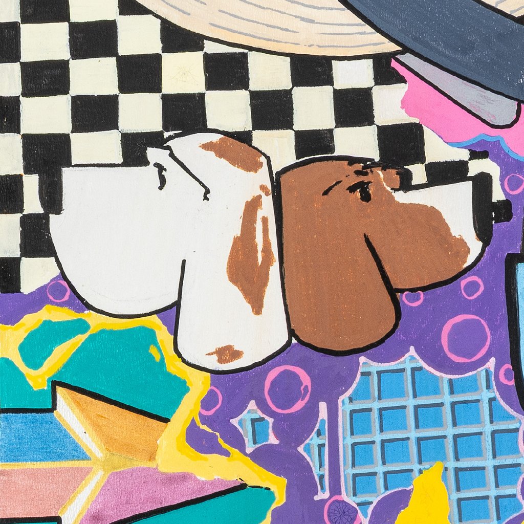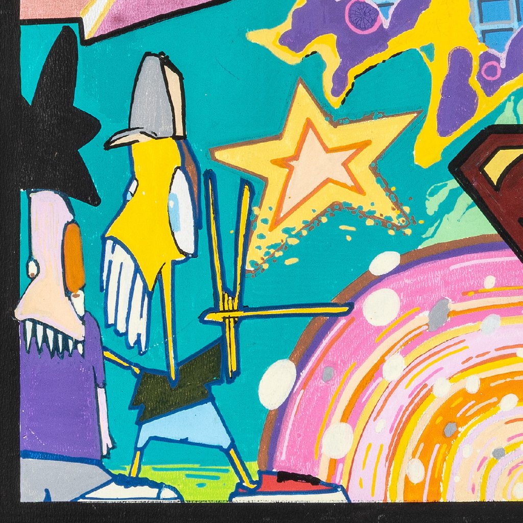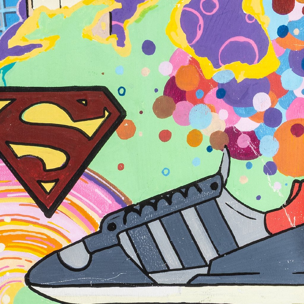 Najdeme zde vše od přírodních motivů (velryba) přes klasické graffiti postavičky (charaktery) až po globální symboly jako logo Supermana nebo ikonickou tenisku. Nechybí ani klasické streetartové prvky jako šachovnice, cihlová zeď nebo komiksové bubliny. Volba sololitu jako podkladu dodává dílu specifickou pevnost. Práce fixem je zde dovedena do ilustrátorské dokonalosti – barvy jsou jasně oddělené, kontury ostré a celé dílo působí velmi čistým, téměř tištěným dojmem, přestože jde o ruční práci. Černý rámovací okraj, který je součástí malby, koncentruje dění uvnitř obrazu a dodává mu charakter „okna“ do autorovy mysli. Je to vizuální encyklopedie stylu, která baví svou barevností i hravostí.